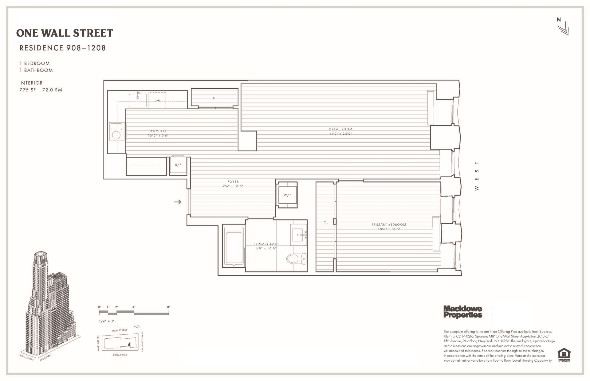 Move In Ready! Residence 1208 is a 775 SF, spacious one bedroom layout within One Wall Street. Located in the West side of the building, this home offers natural light, and ample closet space. Custom kitchens and baths pair seamless technology with classic elegance. The Kitchen features Oceanwood marble slab countertops, which rest on custom Aran Cucine cabinetry, accented by white glass panels and satin nickel finishes and is the perfect blend of beauty and function.
