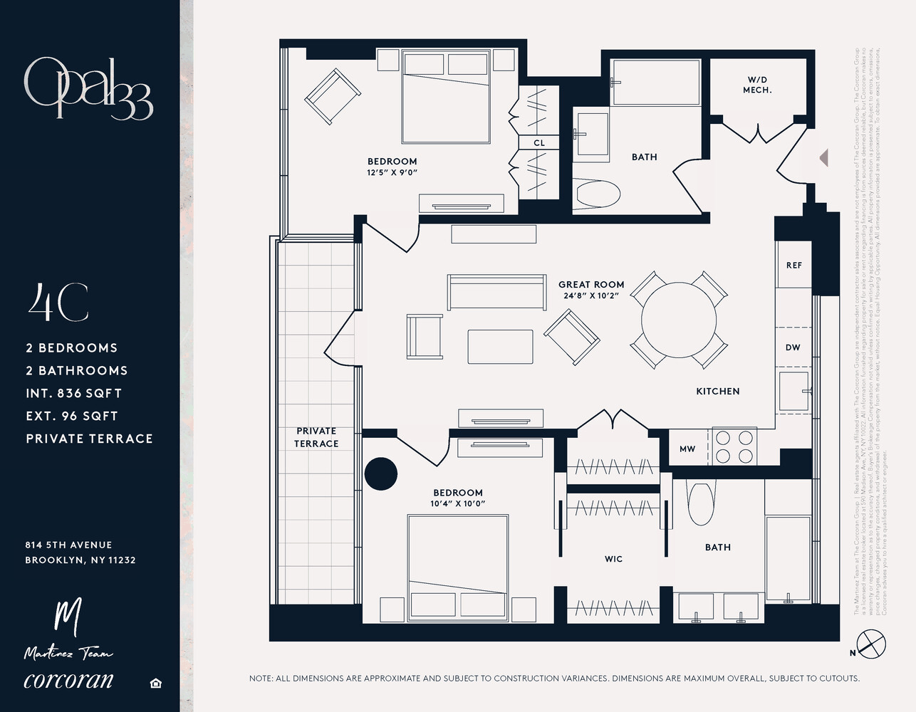 Welcome to Residence 4C at Opal 33, an architecturally striking two-bedroom, two-bathroom retreat that unites modern design, dramatic volume, and boutique comfort. With 836 square feet of interior space and a 96 square-foot private terrace, this light-filled home is designed for seamless indoor-outdoor living. Defined by double-height ceilings and a nearly 25-foot-long great room, the residence is enveloped in floor-to-ceiling glass, framing leafy treetop views and flooding the interior with natural light.