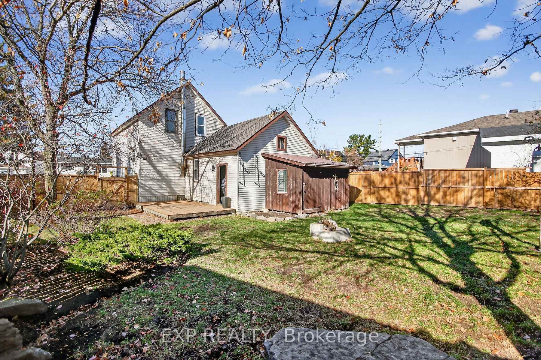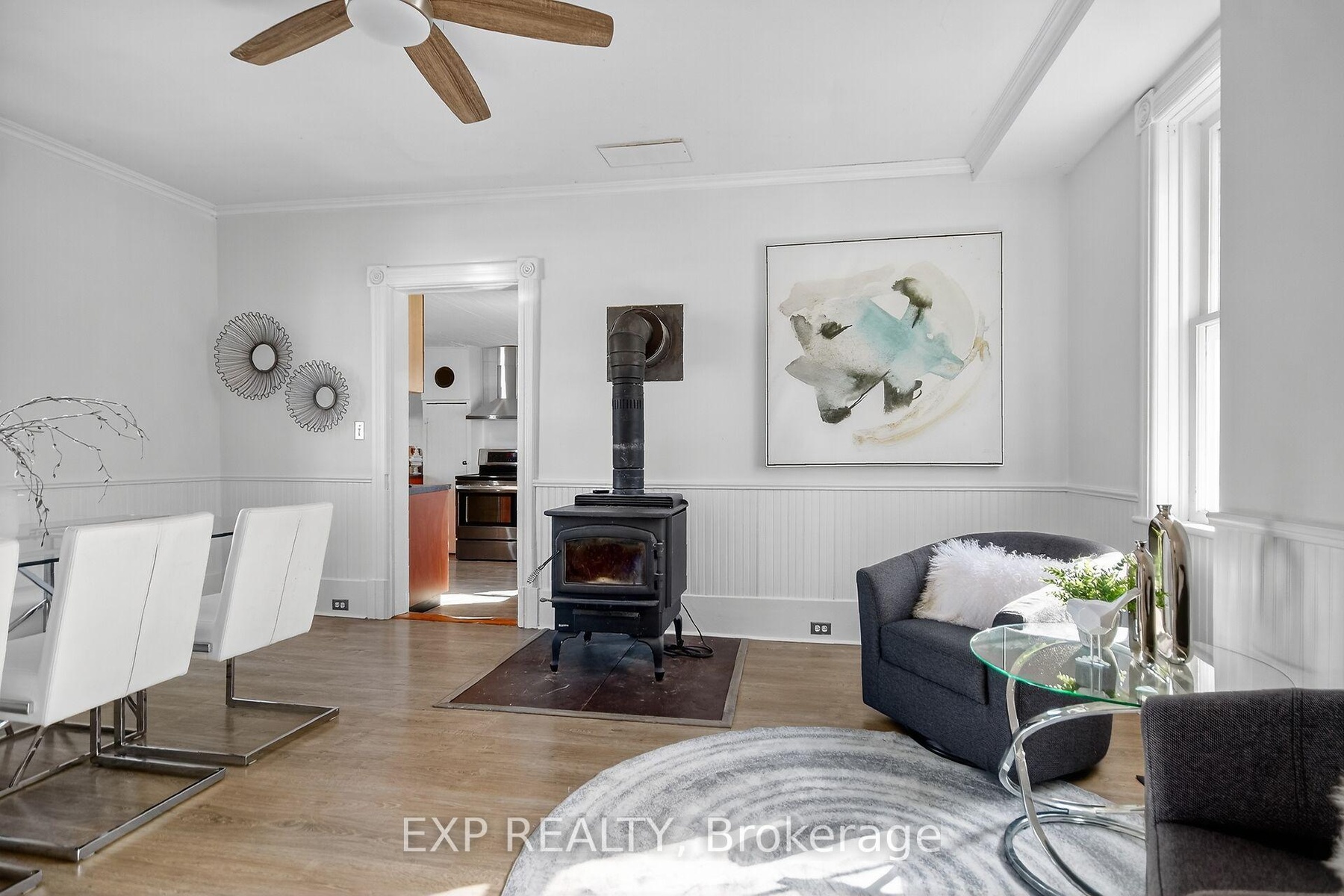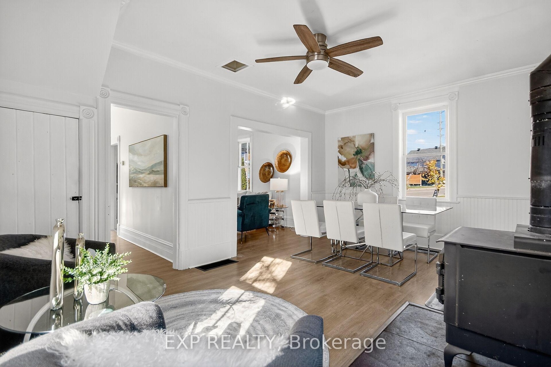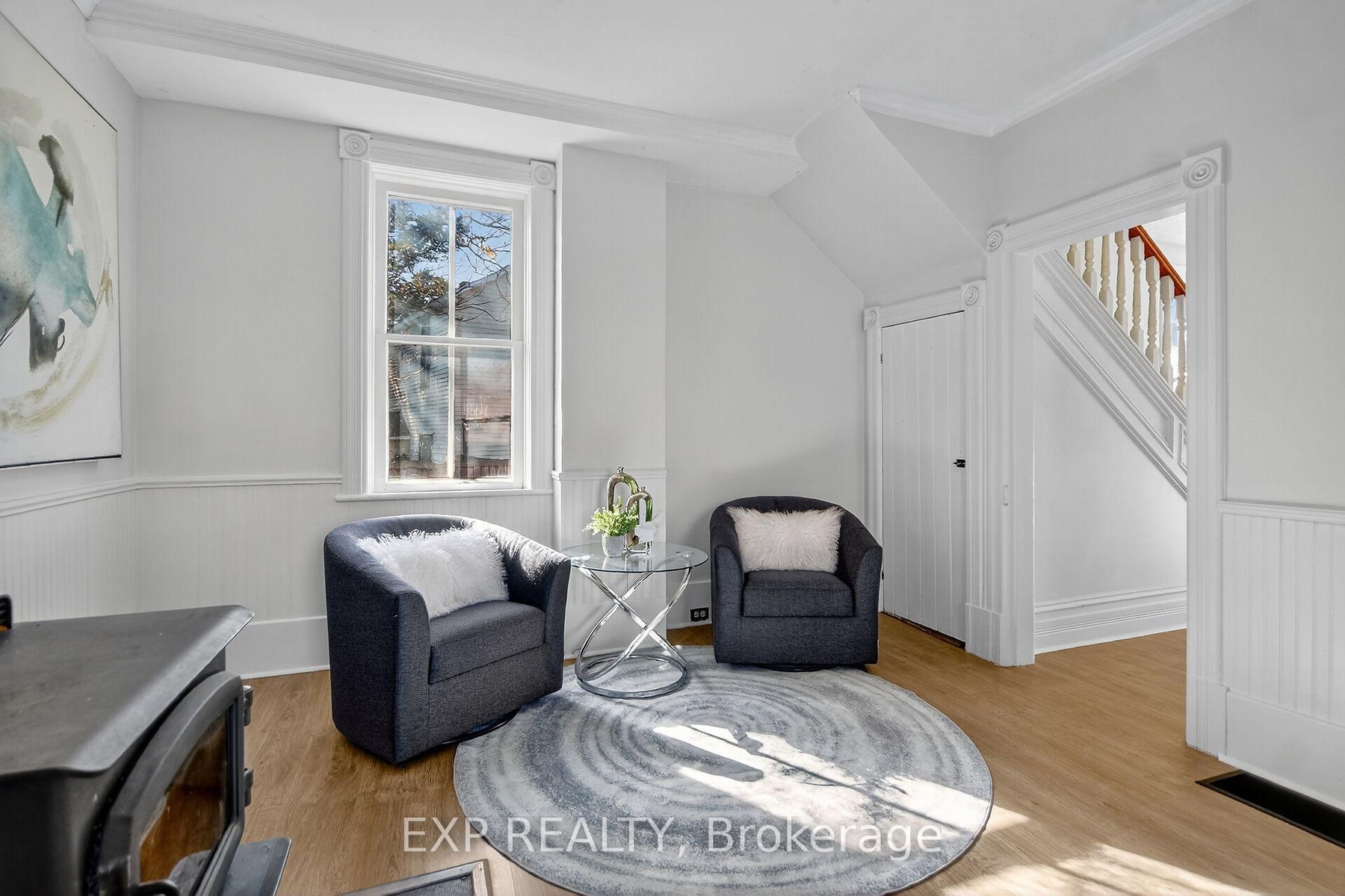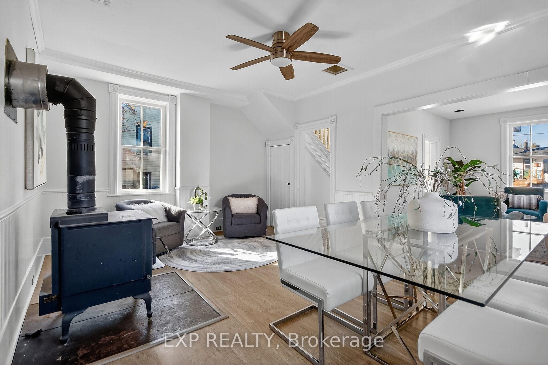 Experience the timeless appeal of 95 Main Street, a charming 1900 Victorian home in the vibrant heart of Almonte. Rich with original character, this vintage home features wide baseboards, lofty ceilings, and a classic 3-season front porch-perfect for morning coffees and warm welcomes. Inside, modern comforts embrace historic charm: easy-care vinyl flooring runs throughout the main level, complemented by newly replaced windows that fill each space with natural light.The open, sunlit living room flows into a large dining area anchored by a cozy wood-burning stove-a perfect gathering spot on winter evenings. The homey kitchen is equipped with stainless steel appliances and convenient in-unit laundry, while the attached shed offers added storage and handy backyard access. Upstairs, unwind in a vintage-inspired bath with a claw-foot tub and pedestal sink. The bright, spacious primary bedroom boasts high ceilings and plentiful storage, and two additional bedrooms (one with a closet, the second without). Plush comfortable carpeting throughout the second floor. Outside, find tandem parking for four vehicles and a fully fenced, generous yard with a large deck-an ideal retreat for children and pets. Moments from the OVR Trail, library, and the shops and cafes of Mill Street, this is Almonte living at its best. Welcome to 95 Main Street ~ a beautiful blend of history, comfort, and community.