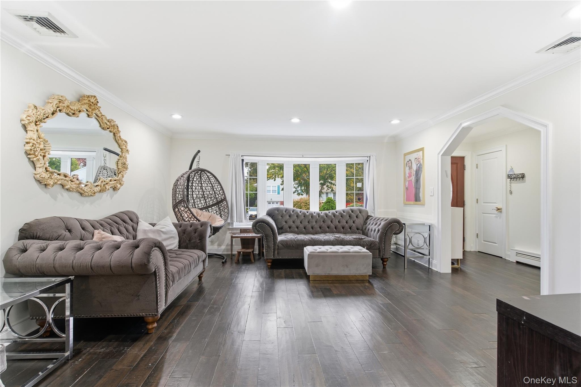 - Living area featuring crown molding, arched walkways, dark wood-type flooring, baseboard heating, and recessed lighting