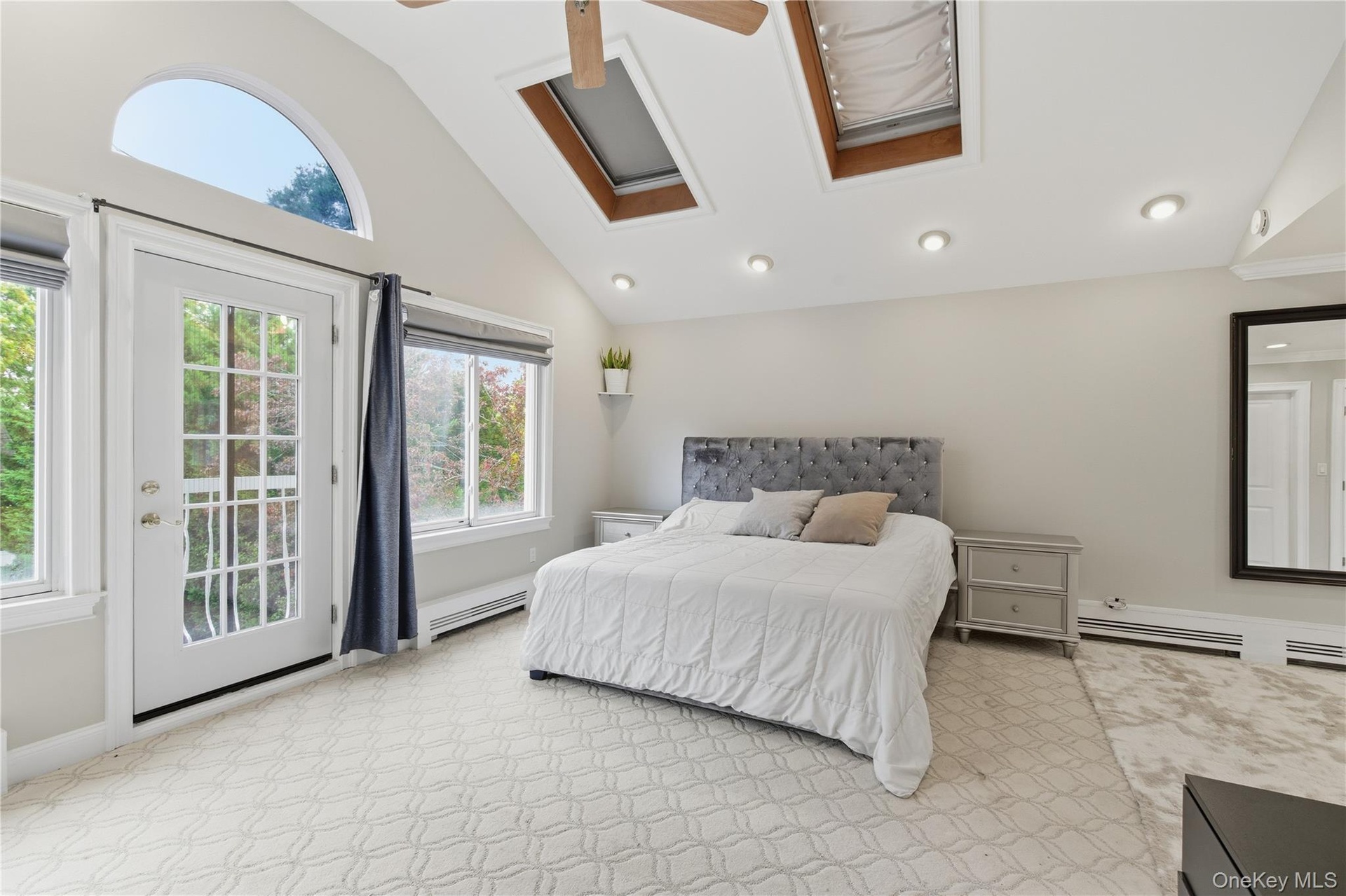 - Bedroom featuring access to exterior, light carpet, high vaulted ceiling, a ceiling fan, and baseboard heating