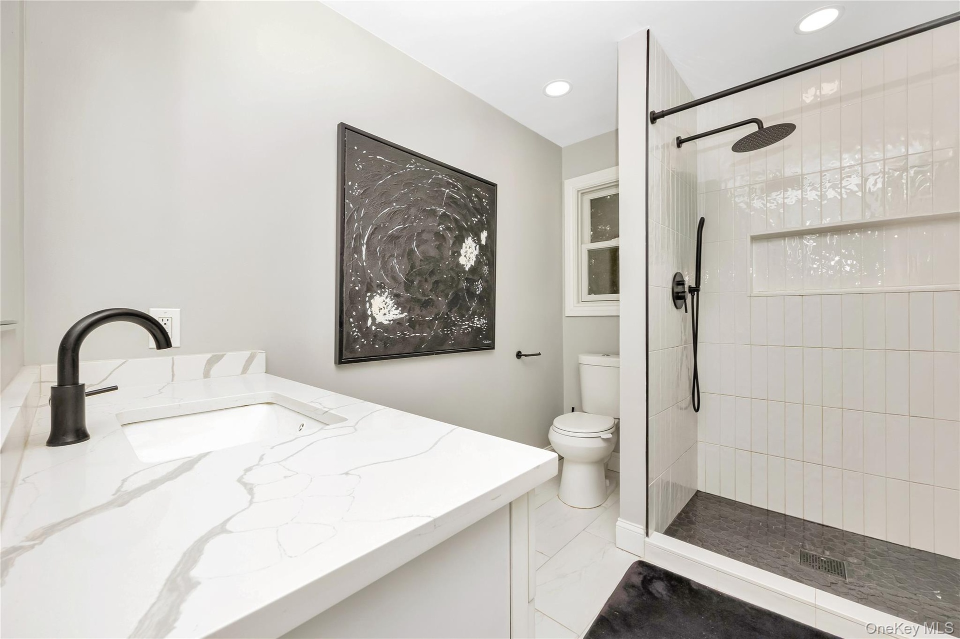 - Full bathroom featuring vanity, a tile shower, and light marble finish flooring