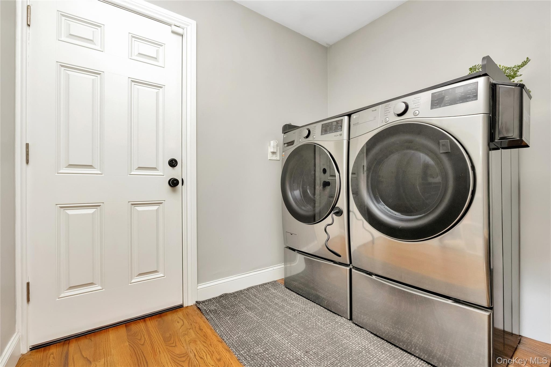 - Washroom featuring light wood-style floors and independent washer and dryer