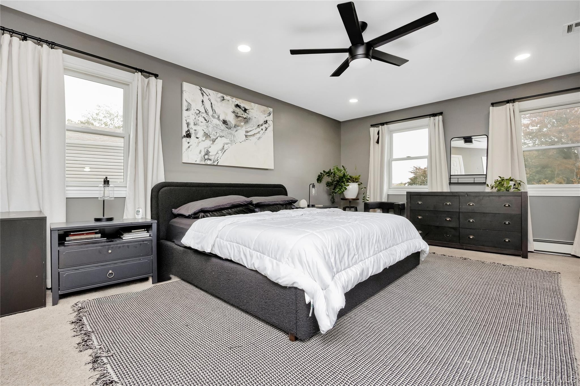 - Carpeted bedroom with ceiling fan, a baseboard radiator, and recessed lighting