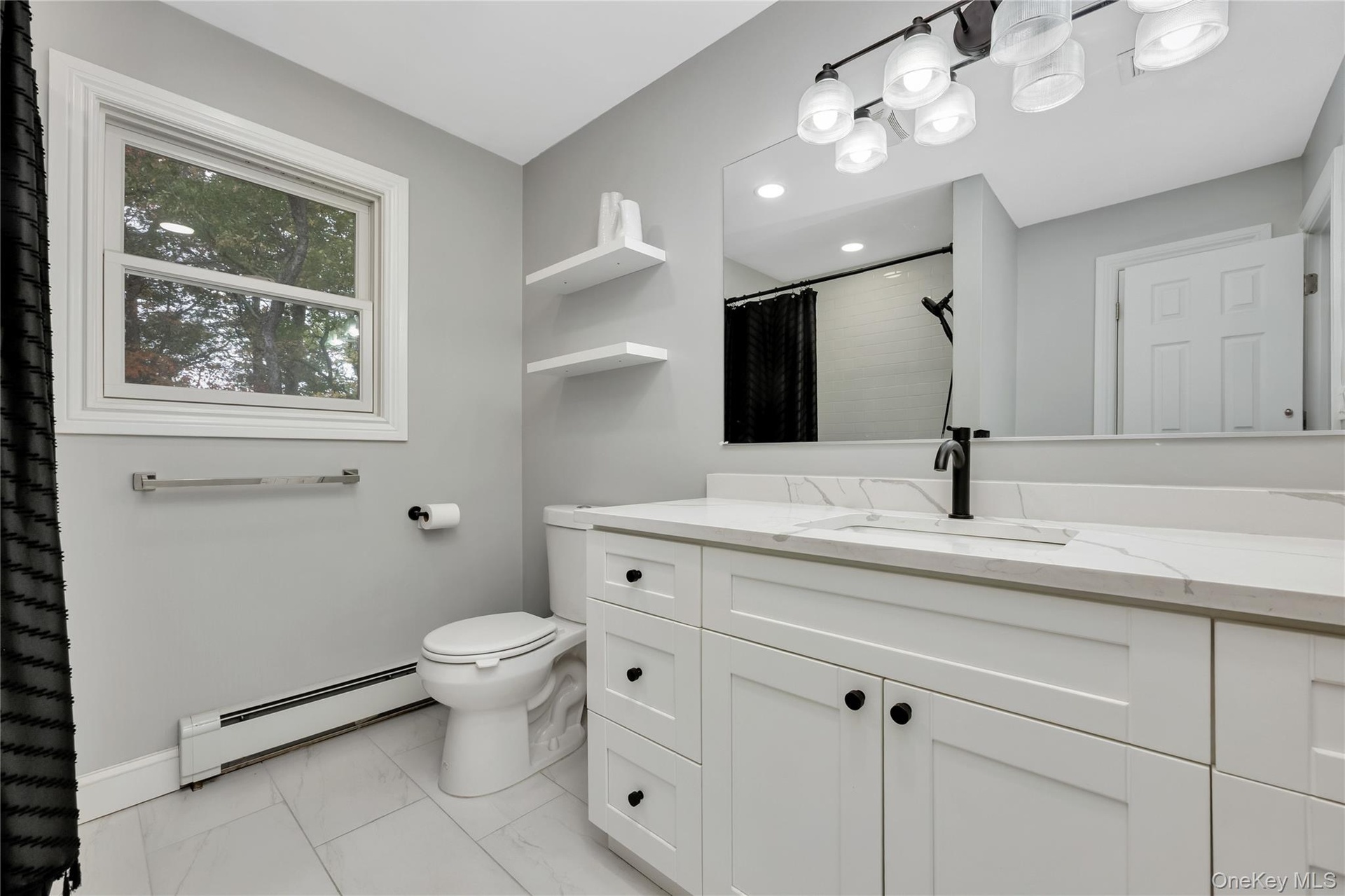 - Full bath with a baseboard radiator, vanity, and a shower with curtain