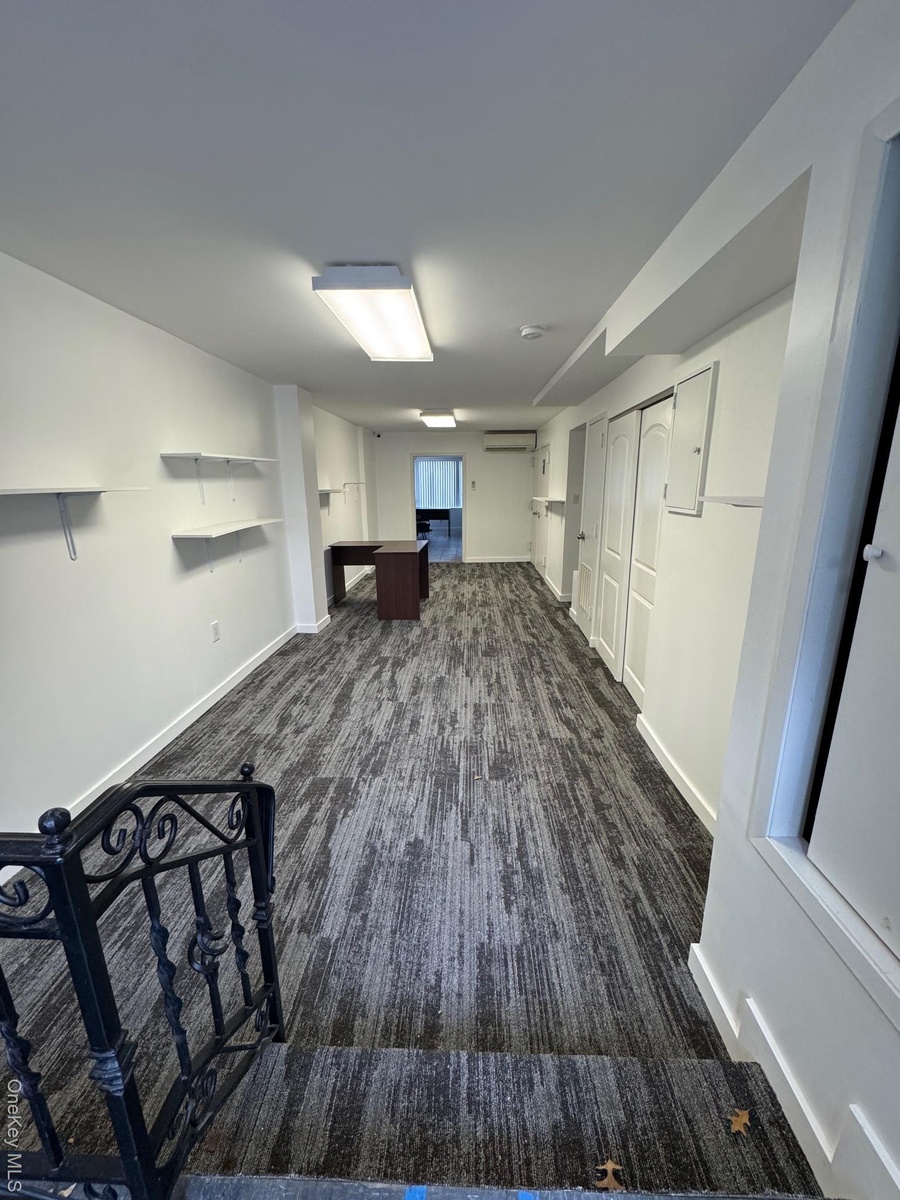 - Below grade area with dark carpet and a wall mounted air conditioner