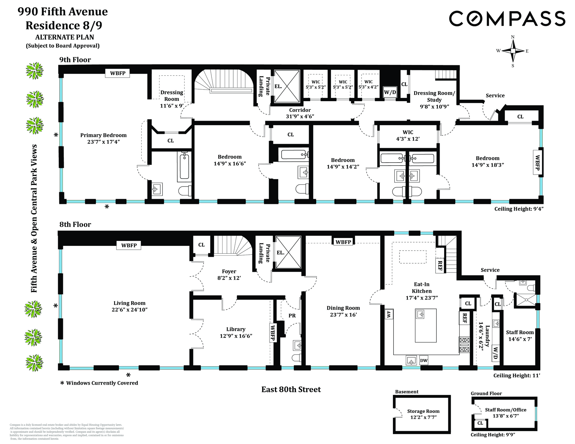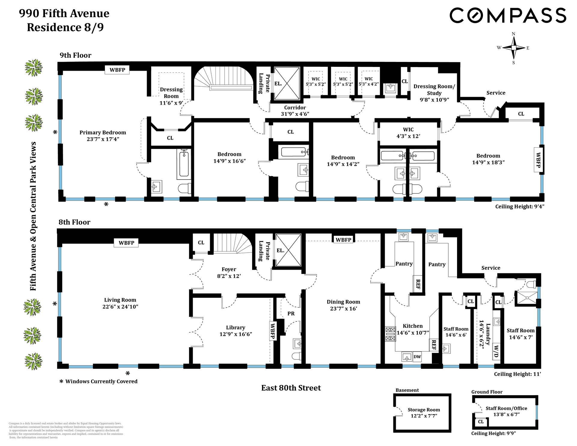 While the apartment needs a full renovation, it maintains the marvelous bones and details of Candela's original design. A private elevator landing opens into the apartment with its soaring 11 foot ceilings, and one enters the foyer from which all the entertaining rooms radiate.  The grand corner and light-filled living room features antique parquet floors, exquisite moldings, a fireplace with a stunning marble mantle, and boasts breathtaking views of Central Park, Central Park West, the Metropolitan Museum of Art, and the midtown skyline. The inviting panelled library also has a wood-burning fireplace with marble mantle, as does the formal dining room, which has magnificent inlaid marble floors. A kitchen, butler's pantry, three staff rooms, and a bathroom complete this floor.