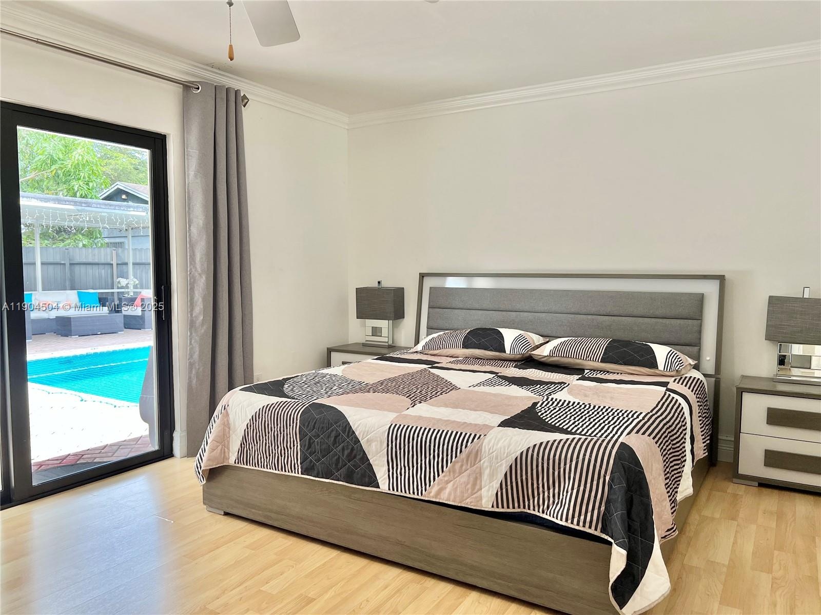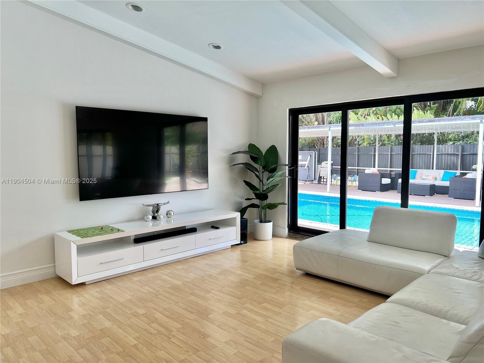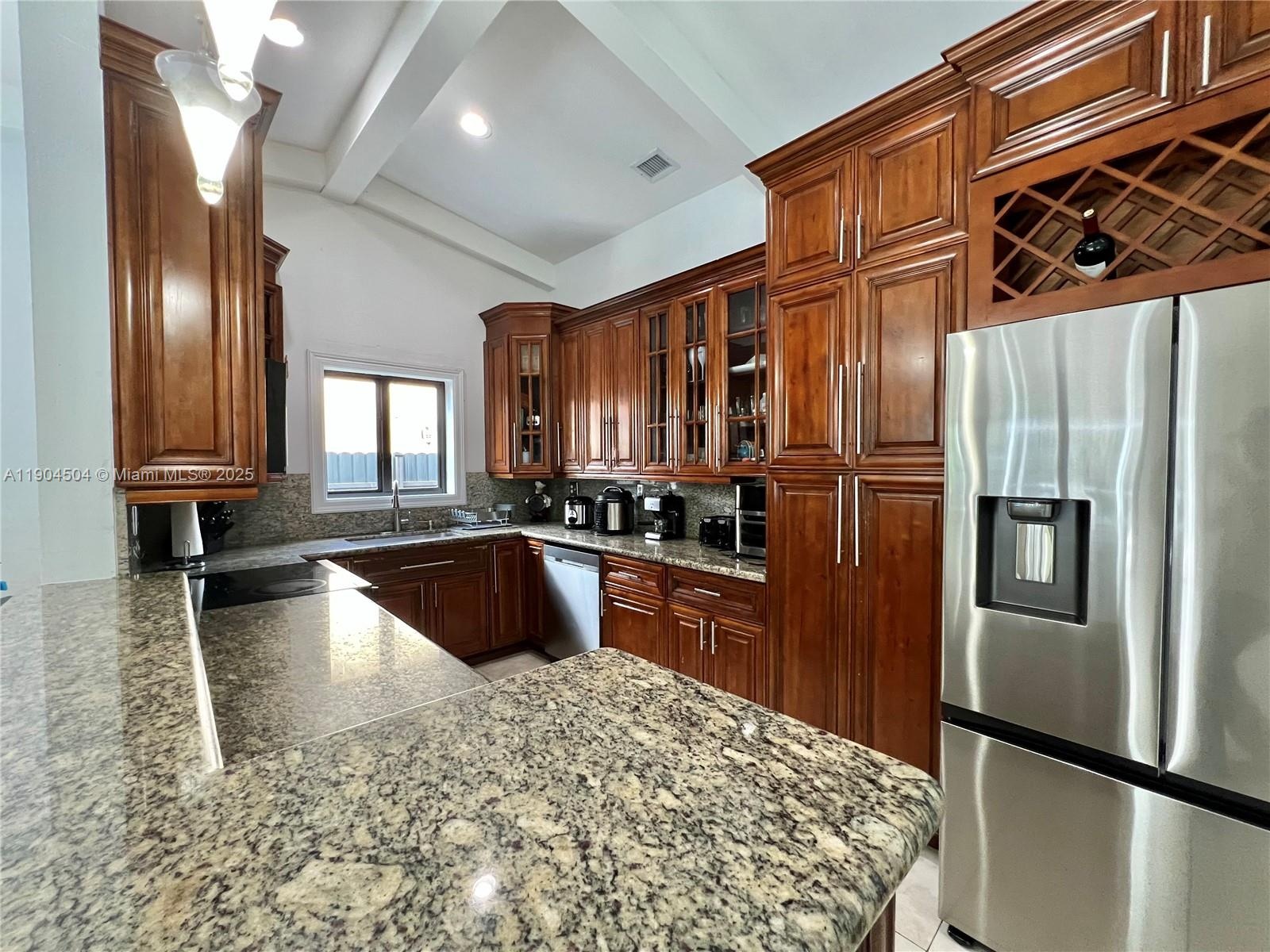 Beautiful single family home, 4 bedrooms and 2 bathrooms, a large pool with water heater, a covered terrace and a 2 car garage with a spacious circular driveway and ample space for 6 or more cars, concrete and metal fenced all around the house. Move-in ready, very spacious property with vaulted ceilings and large spacious kitchen and family room, living room and dining room in open concept. The kitchen features wood cabinets to the ceiling with granite countertop & stainless steel new appliances. It features tankless water heater. Plenty of space backyard to enjoy around the pool with family or entertain. The tiled roof was installed in 2022 with modern and heavy brown impact windows and doors hotel style that gives the property a modern touch. The air conditioner was replaced in 2022.