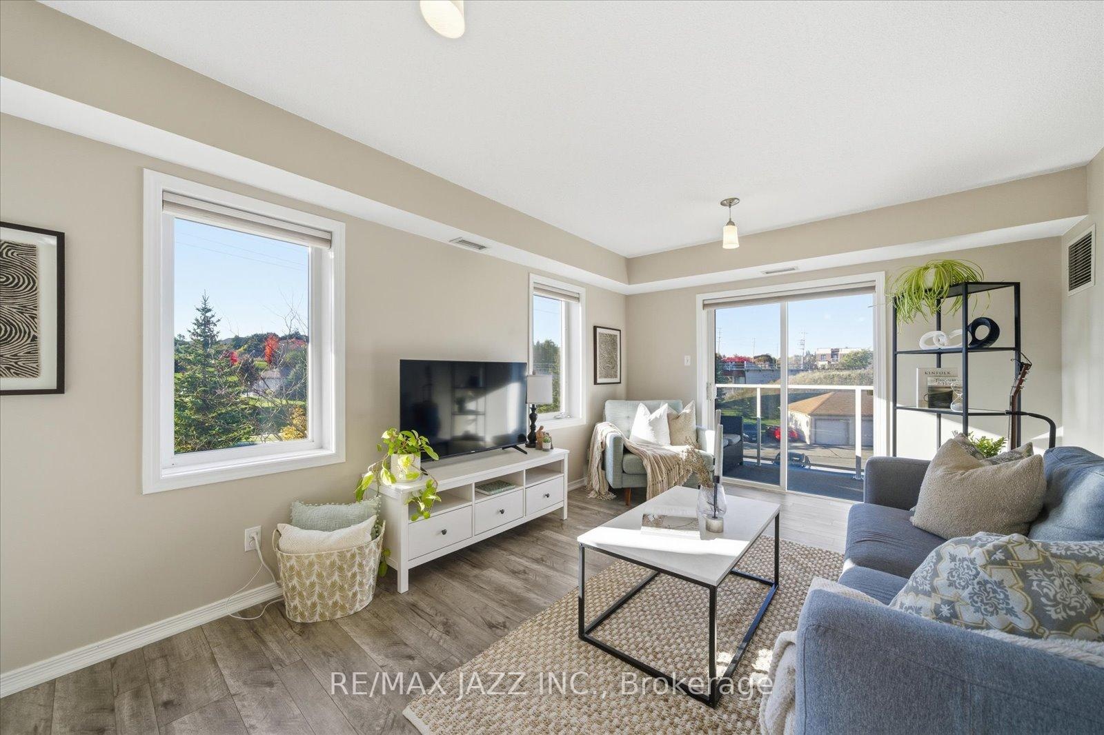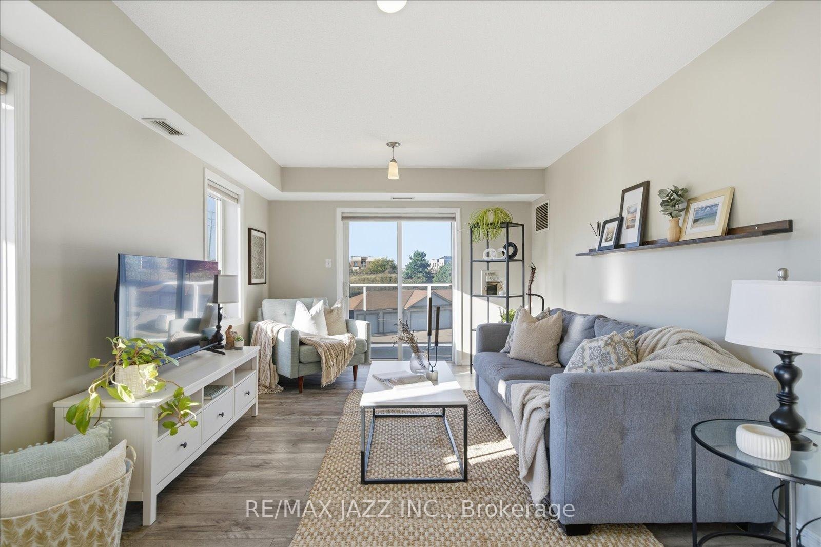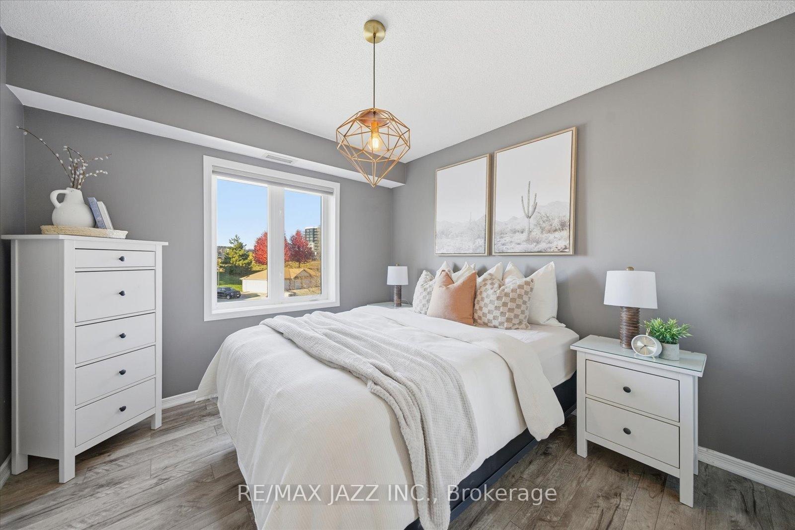 Welcome to this beautifully updated corner suite offering western exposure and an abundance of natural light. Step inside to discover new laminate flooring, pot lights, and custom window coverings throughout. The modern kitchen boasts a large eat-in area with a breakfast bar overlooking a bright and spacious living room, perfect for entertaining or relaxing. The primary bedroom includes a walk-in closet, and there's convenient ensuite laundry as well. Tastefully decorated from top to bottom-there's truly nothing to do but move in and enjoy. Located close to all amenities, shopping, parks, schools, and the future GO Train, this home offers the perfect blend of comfort, convenience, and style. This rare find features a private garage, an additional parking space, and a locker-one of the few units in the complex offering all three!