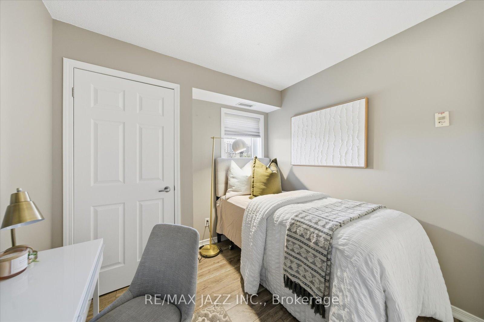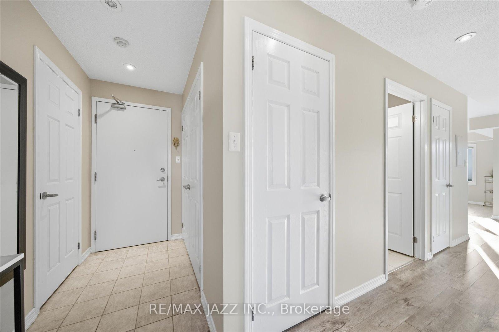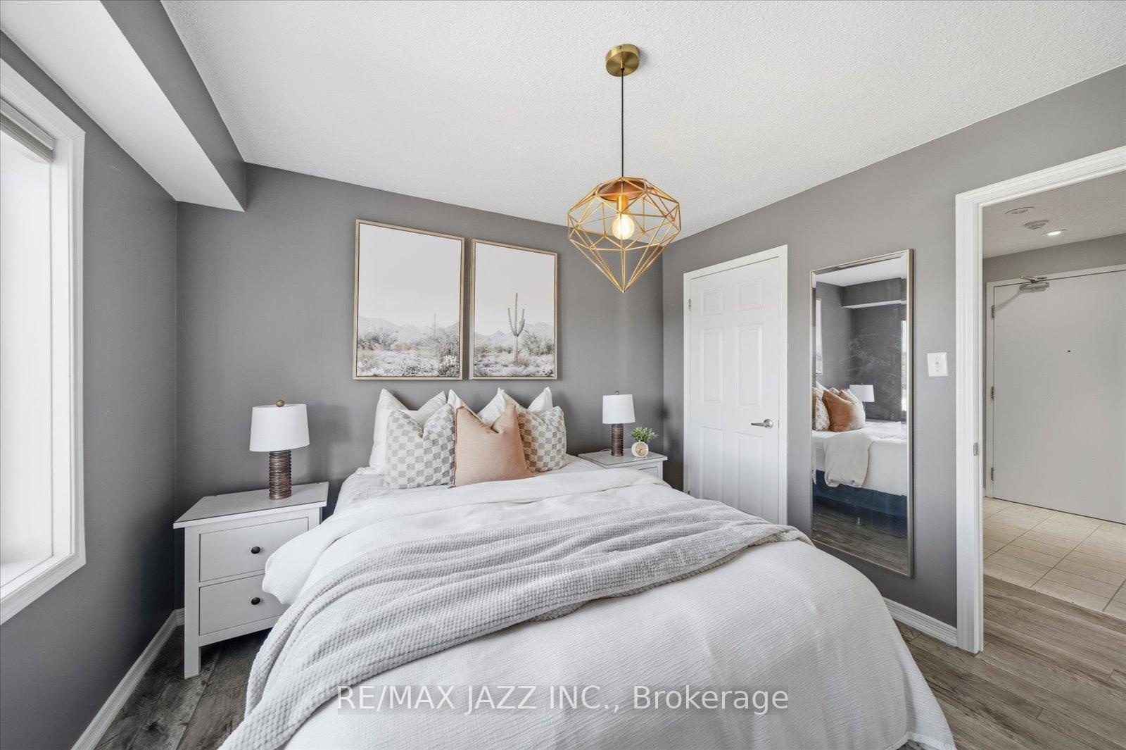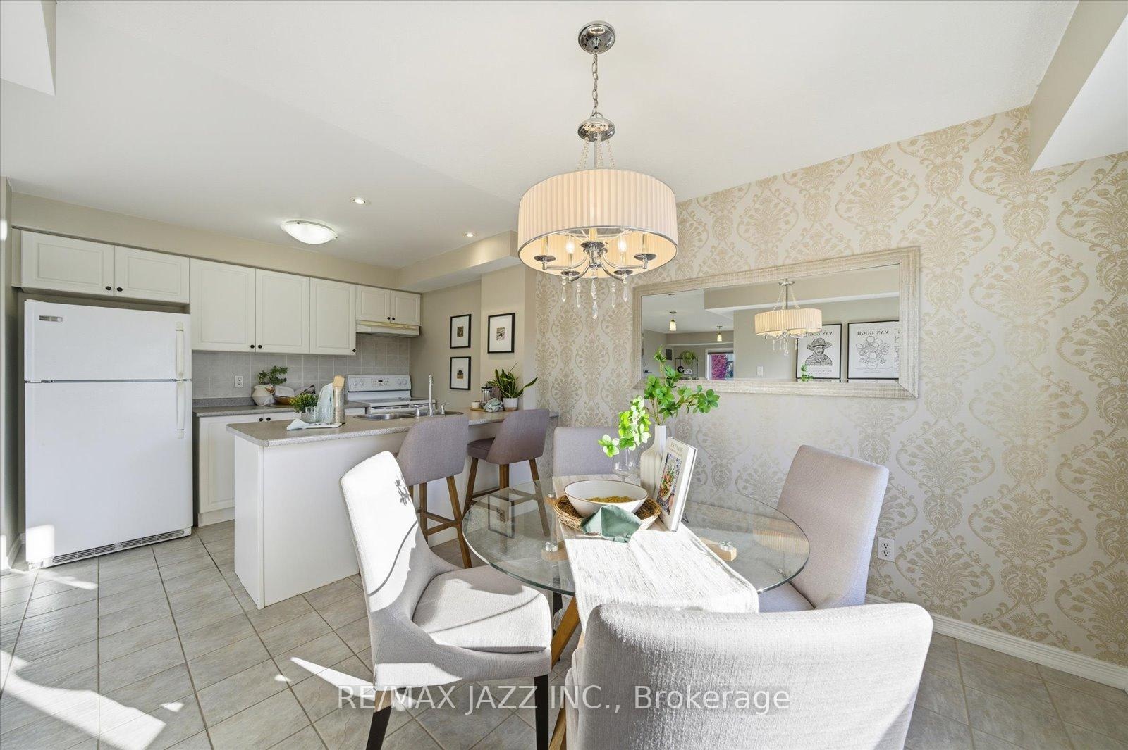 Welcome to this beautifully updated corner suite offering western exposure and an abundance of natural light. Step inside to discover new laminate flooring, pot lights, and custom window coverings throughout. The modern kitchen boasts a large eat-in area with a breakfast bar overlooking a bright and spacious living room, perfect for entertaining or relaxing. The primary bedroom includes a walk-in closet, and there's convenient ensuite laundry as well. Tastefully decorated from top to bottom-there's truly nothing to do but move in and enjoy. Located close to all amenities, shopping, parks, schools, and the future GO Train, this home offers the perfect blend of comfort, convenience, and style. This rare find features a private garage, an additional parking space, and a locker-one of the few units in the complex offering all three!