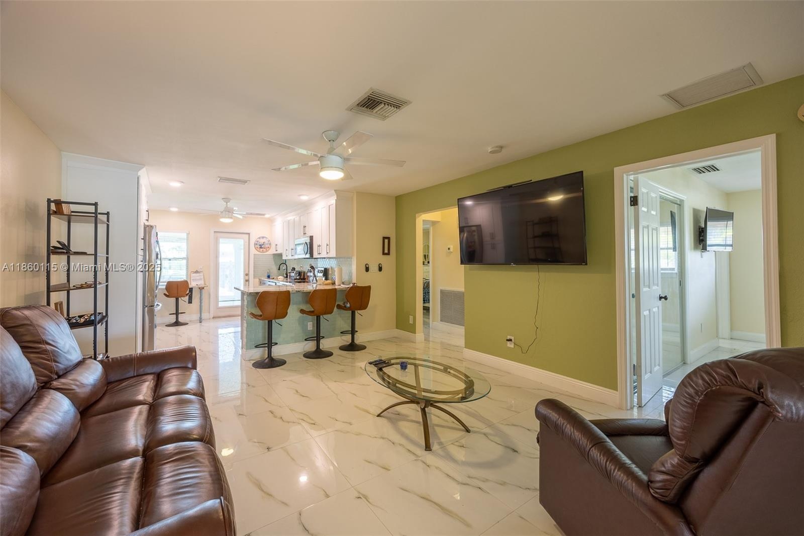 Waterfront! Room for two boats 38 feet or longer. 1 lift & 1 in the water at the pier. More dockage could be added. S/SW view on a 200 ‘+ canal. Gulf access & Approx. 10 minutes idle to the river and 5 miles to open water! Almost 1,000 sq ft covered back porches. Each unit features an under-truss additional room added in the front, which is under air and approximately 320 sq ft. Meticulously maintained by the owner/occupants. New roof installed in 2012. New A/C added to the right unit in 2018, and the left unit in 2009. All new tile floors, new bathrooms & kitchens. Near the Bimini Basin & Four Freedoms park. An investor could collect rent on both sides or live in one, rent the other—covered parking for up to 4 vehicles.