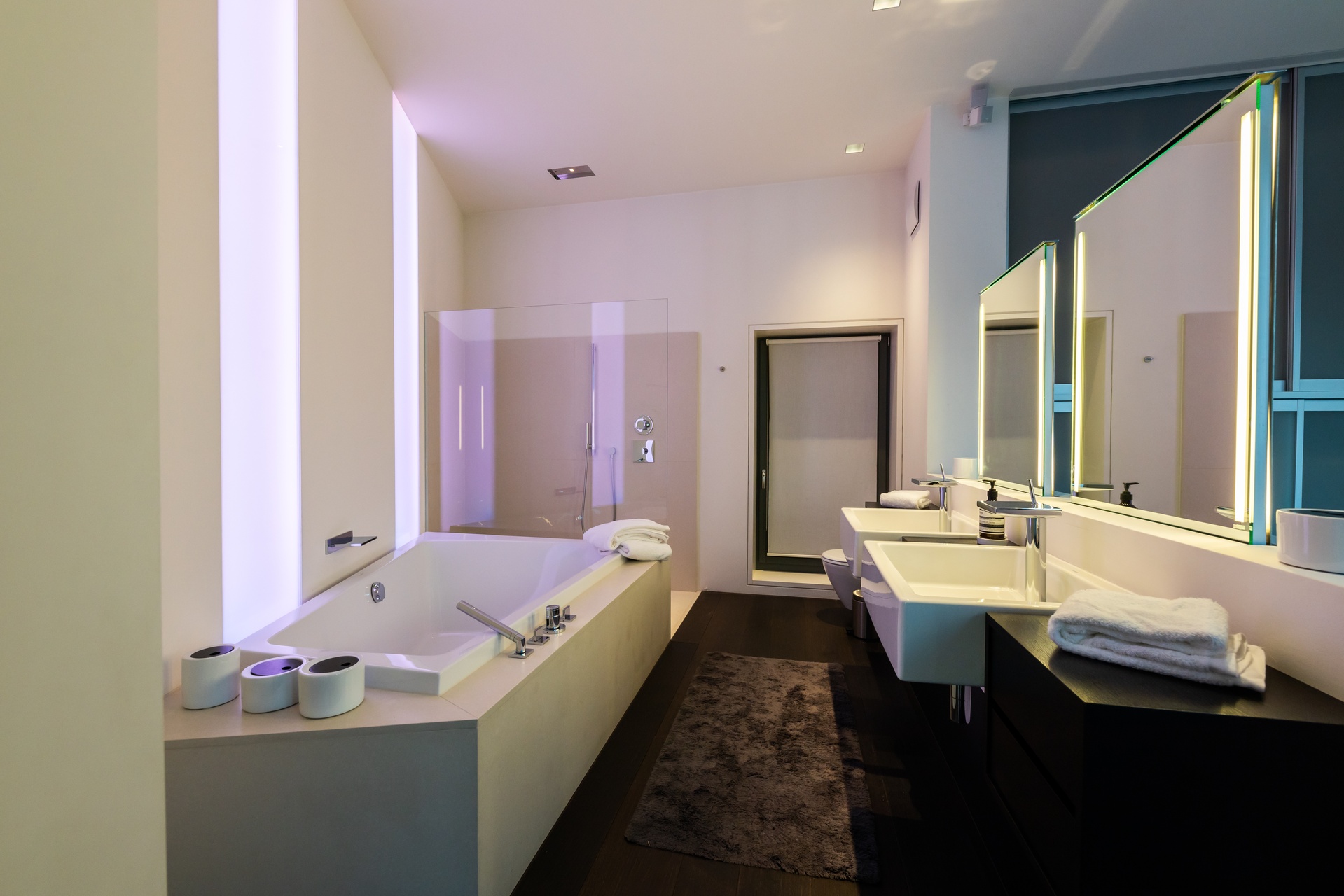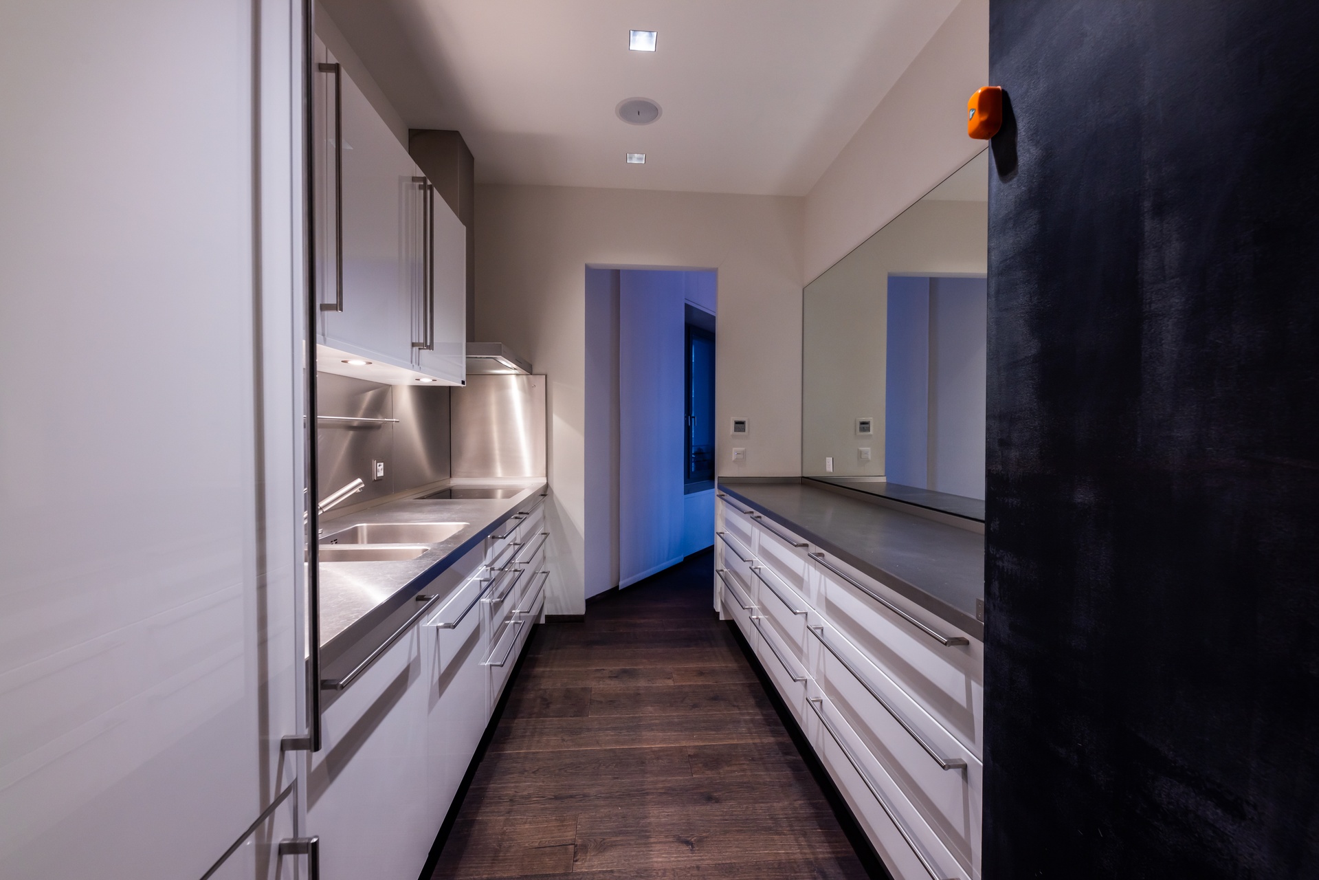 The apartment features an elegant open-plan living area with 4 m high ceilings, large windows framing panoramic views of the lake and surrounding Alps, a grand fireplace, and a cinema projector. The contemporary kitchen and dining area comfortably host up to 10 guests, while soft evening lighting creates a warm, refined ambiance.