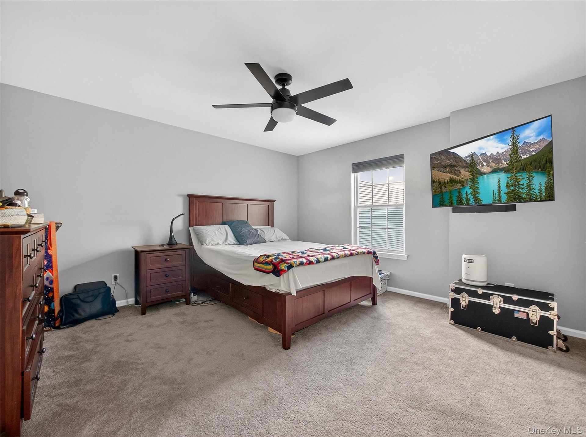 - Bedroom with carpet floors, ceiling fan, and recessed lighting