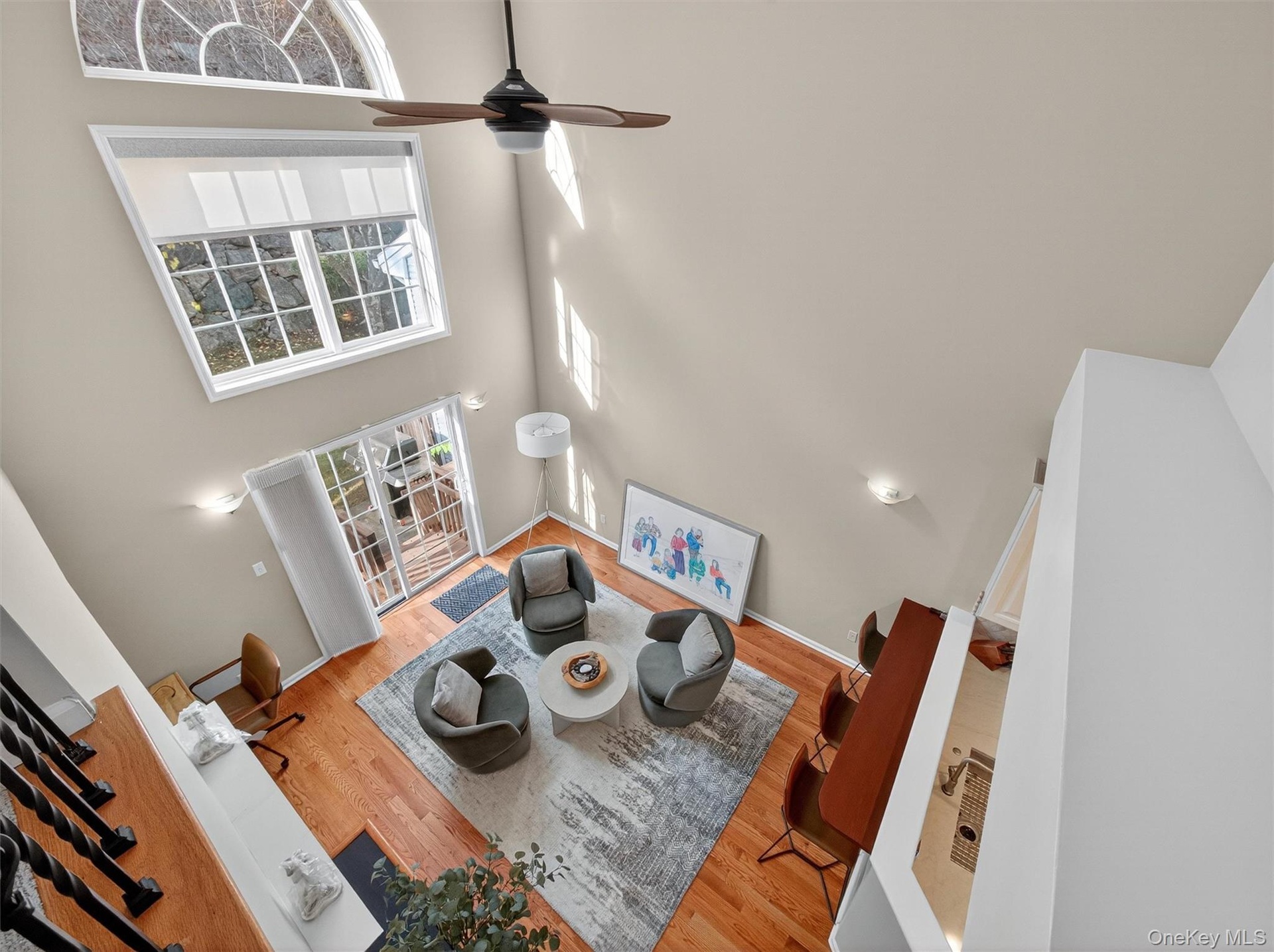 - Living room featuring a glass covered fireplace, hardwood floors, and a cathedral ceiling and very large windows.