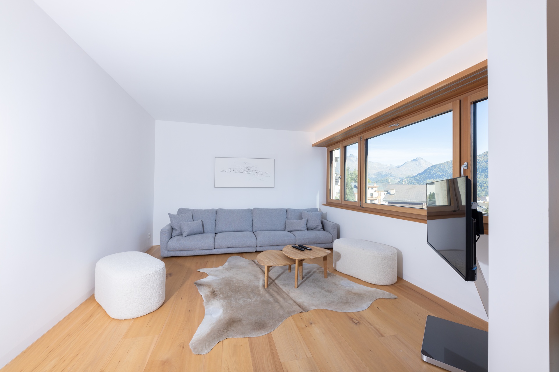 This elegant and newly renovated apartment offers three bedrooms and two bathrooms, making it an ideal accommodation for up to six guests. Located on a quiet street in the centre of St. Moritz, it provides easy access to boutiques, restaurants, ski lifts, and ski slopes.