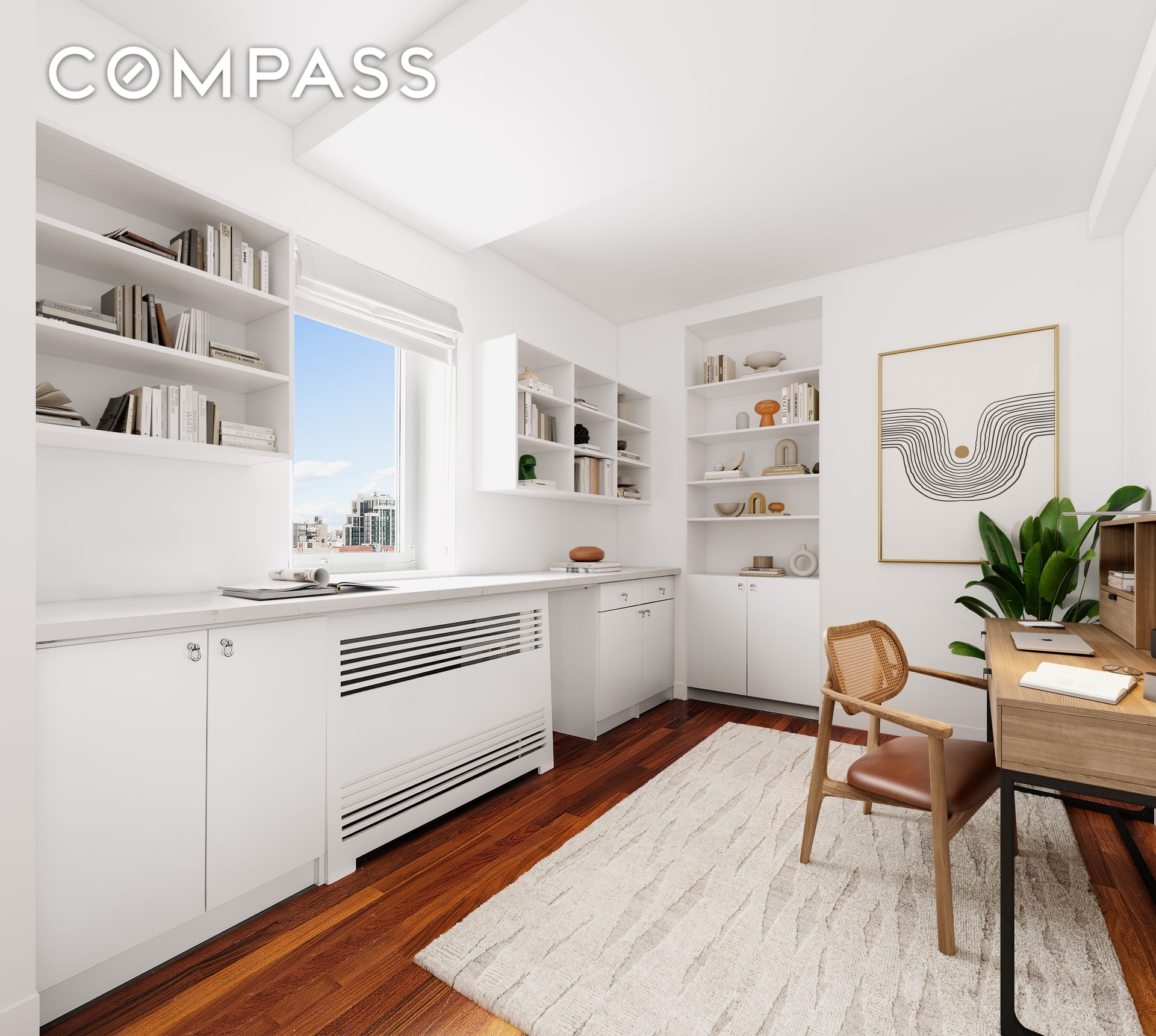 Featuring two walk-in closets, a large bathroom, and a windowed office, the primary bedroom suite is both comfortable and functional. Separated from the public spaces, it’s a private enclave. The bathroom includes a double vanity, a stall shower and separate soaking tub. The spacious office, with an east-facing window, can also be used as a third walk-in closet or a dressing room. The second bedroom includes an en-suite bathroom, features southern exposures, and can easily accommodate a king-size bed.