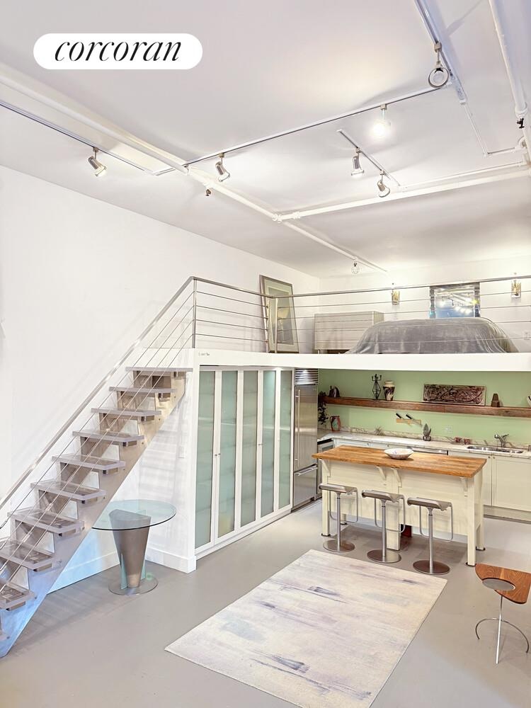 The open layout offers space for living, dining, and more, plus a 300 sq ft mezzanine with 5-ft ceilings. (The owner has previously used it as a sleeping area, reading nook, and home office.) It adds charm and versatility without interrupting the loft's flow.