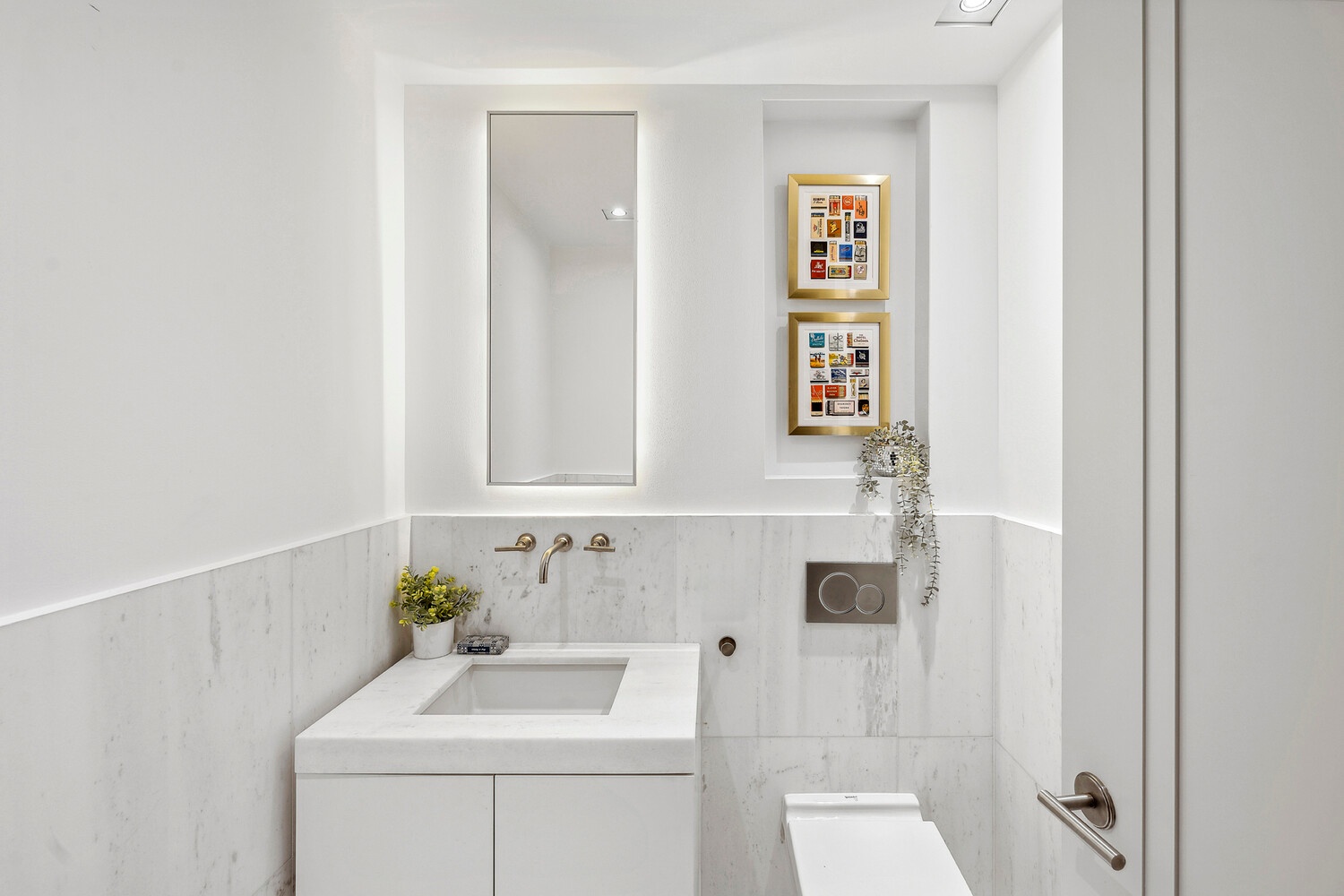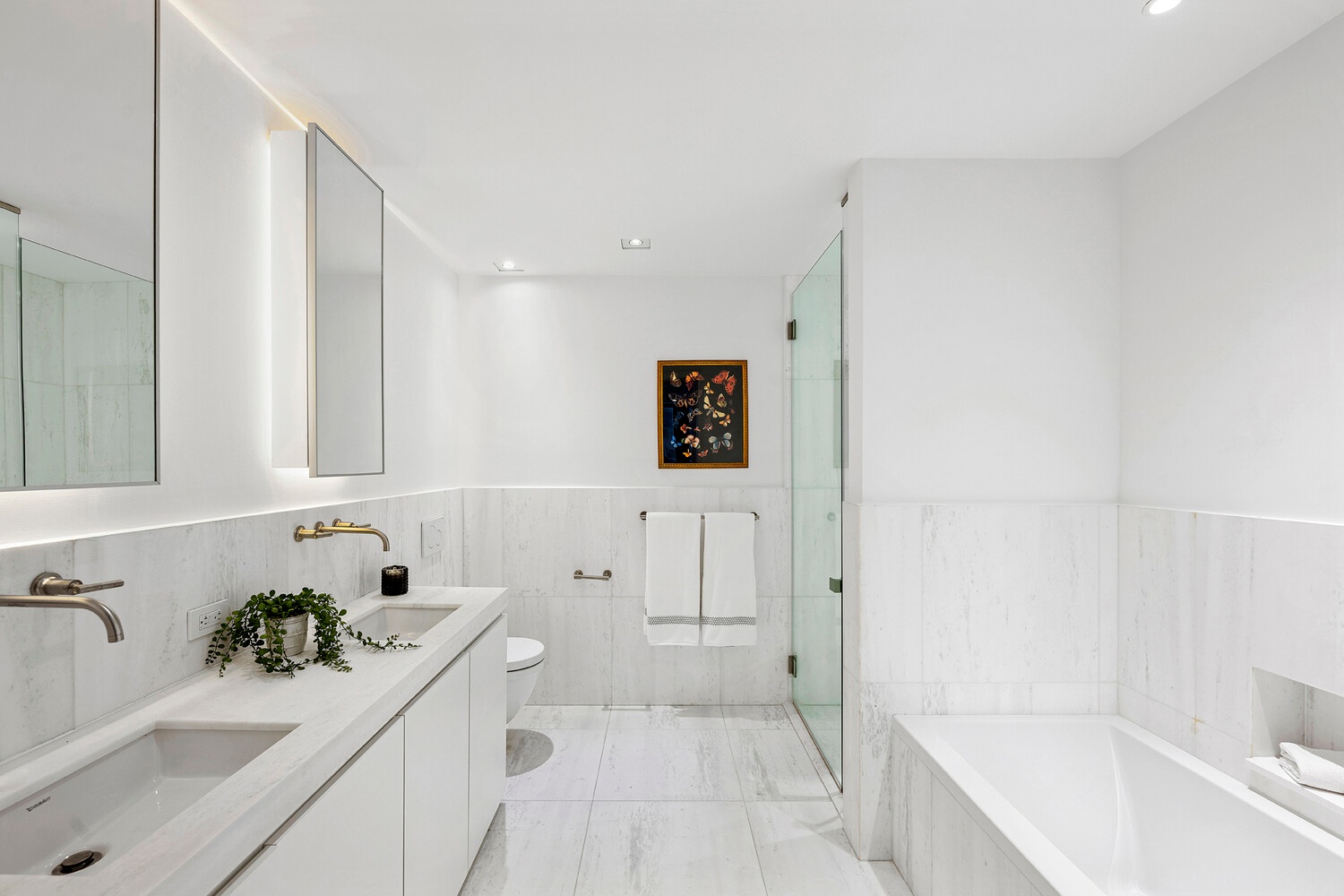 Beyond a practical entryway space adorned with a coat closet and powder room, the home flows into an open-concept living room, dining room, and kitchen. The living and dining rooms are flanked by wall-to-wall windows with views of the East River, while the elegant all-white kitchen is equipped with custom oak cabinetry, honed marble countertops and backsplashes, and a suite of fully- integrated appliances by Bosch.