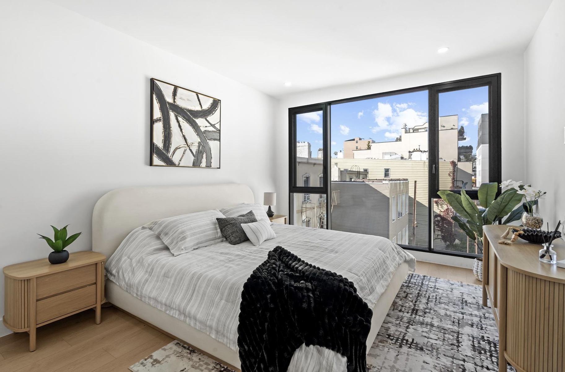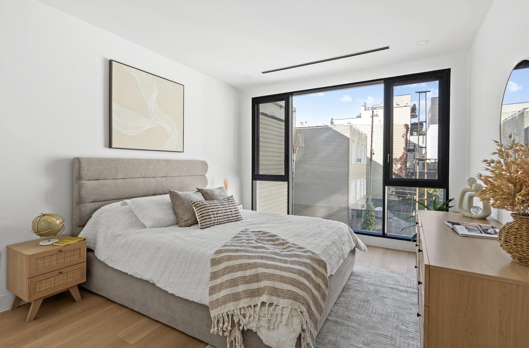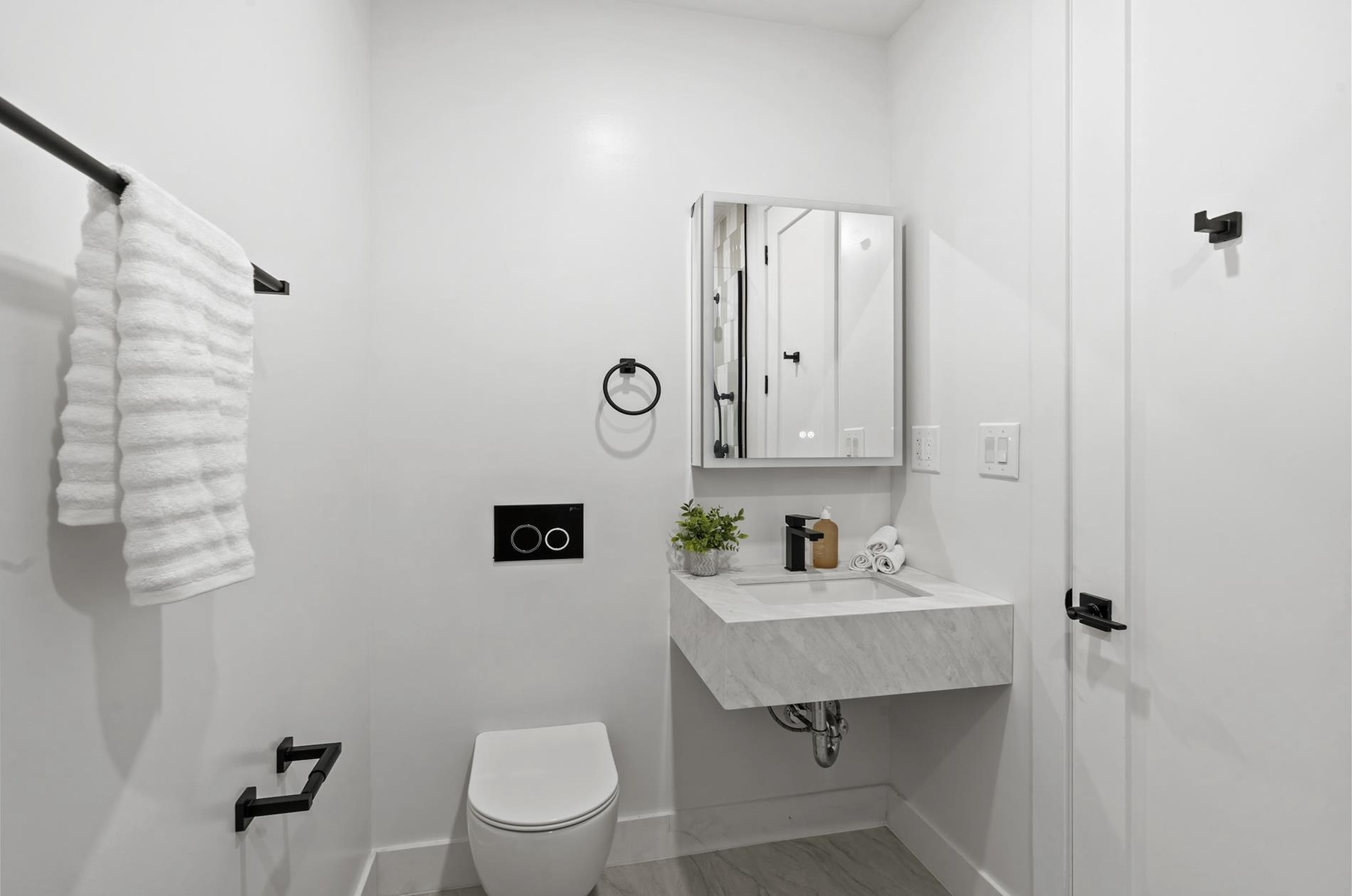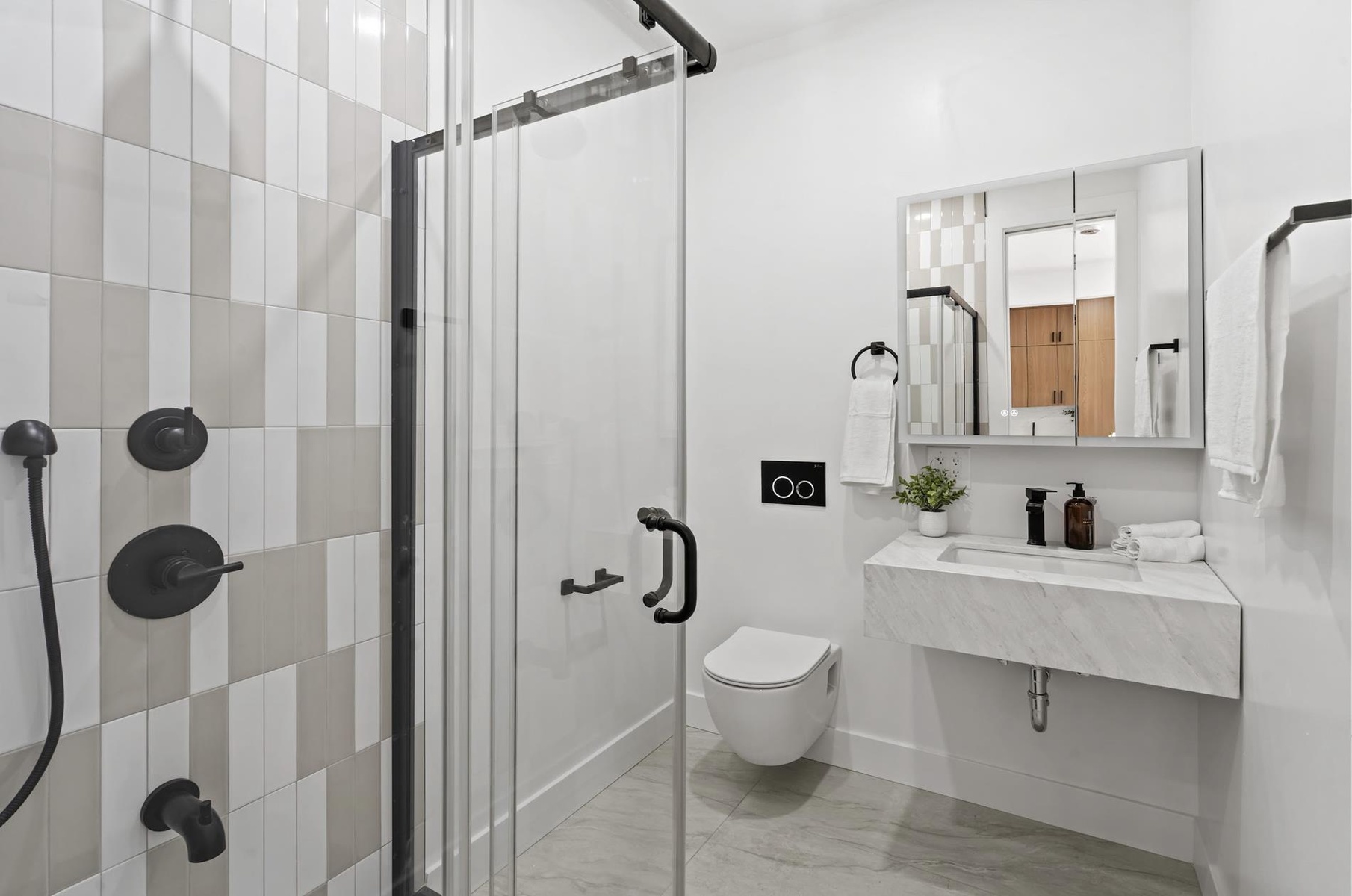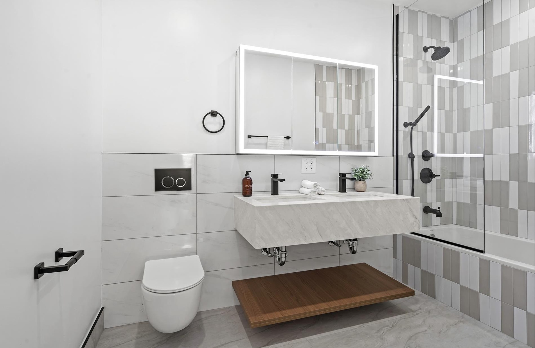 On the second level, the king-size primary suite includes a huge walk-in closet and sumptuous en-suite bathroom with luxurious Delta hardware, a floating natural stone double vanity, a wall-mounted toilet, and a deep soaking tub. The second bedroom can accommodate a king bed and has an oversized reach-in closet and easy access to a full bathroom with a walk-in shower. There is also a laundry closet with a ventless washer/dryer.