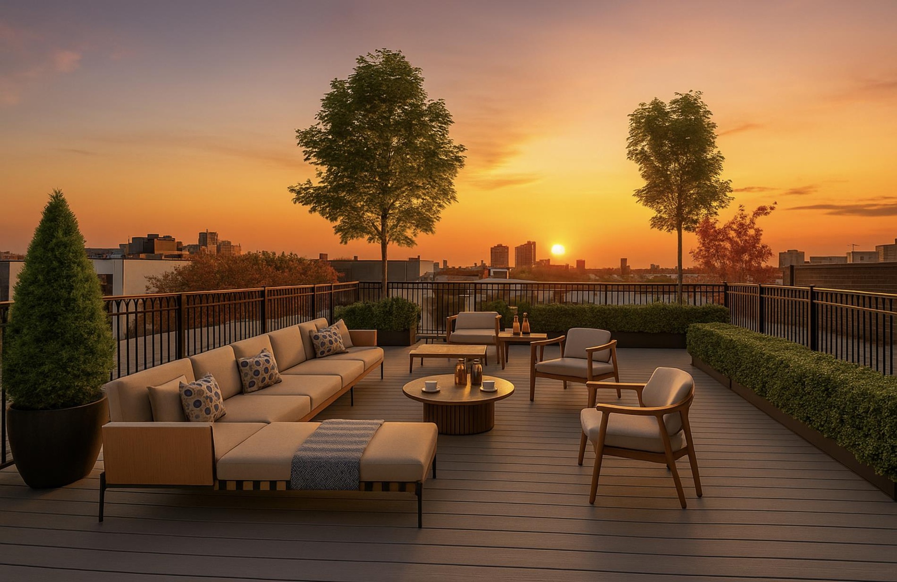 On the upper level is a sun-splashed landing that opens onto a 674-sf. rooftop terrace, the perfect setting for alfresco meals, gardening, sunbathing, and grilling.