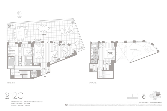 Introducing Duplex Residence 12C. With ceilings soaring up to 18'-6 ", this three-bedroom, three-and-a-half-bathroom residence offers an impressive 1,204 SF private terrace with direct views of the Manhattan Bridge and East River.