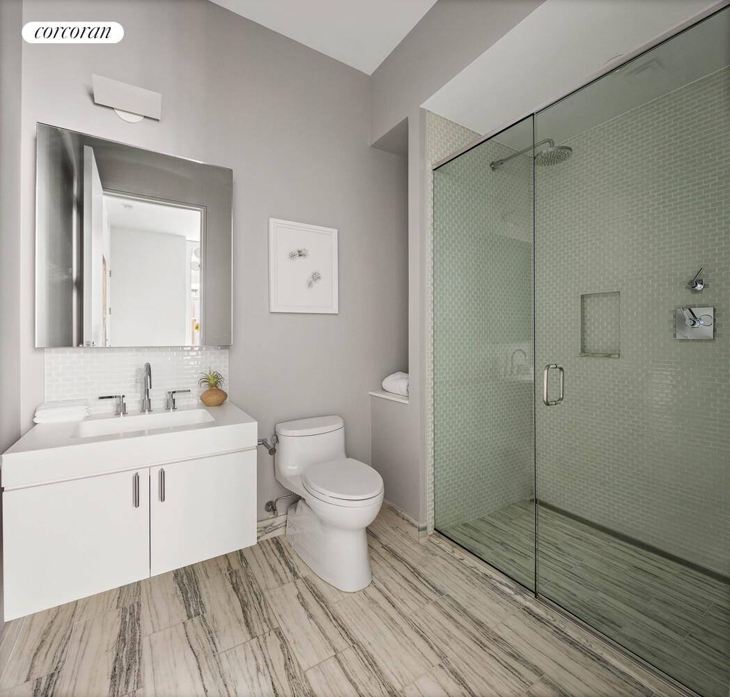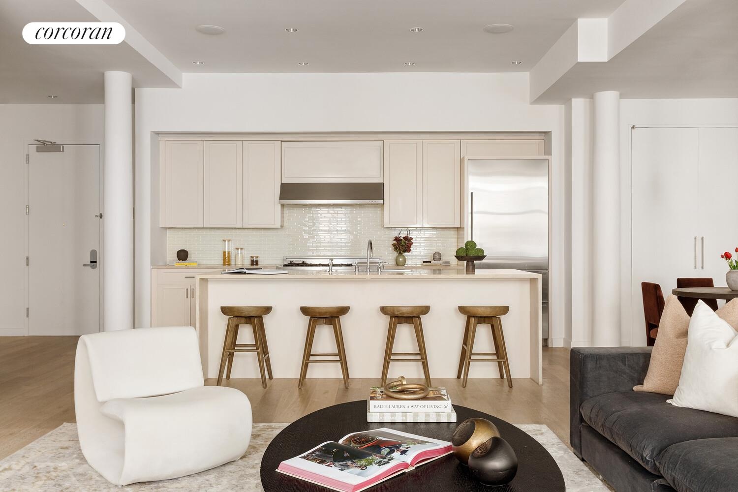 Additional features of this very special offering include wide-plank wood floors, an oversized powder room, multi-zone climate control, custom lighting throughout, washer/dryer, and fully fitted closets. With only 16 units and a part-time doorman (Monday-Friday, 8 a.m.-8 p.m.), 63 Greene was designed for privacy. Residents can enjoy views of the city from the meticulously designed and furnished roof deck featuring pristine landscaping, a waterfall, and multiple seating areas.
