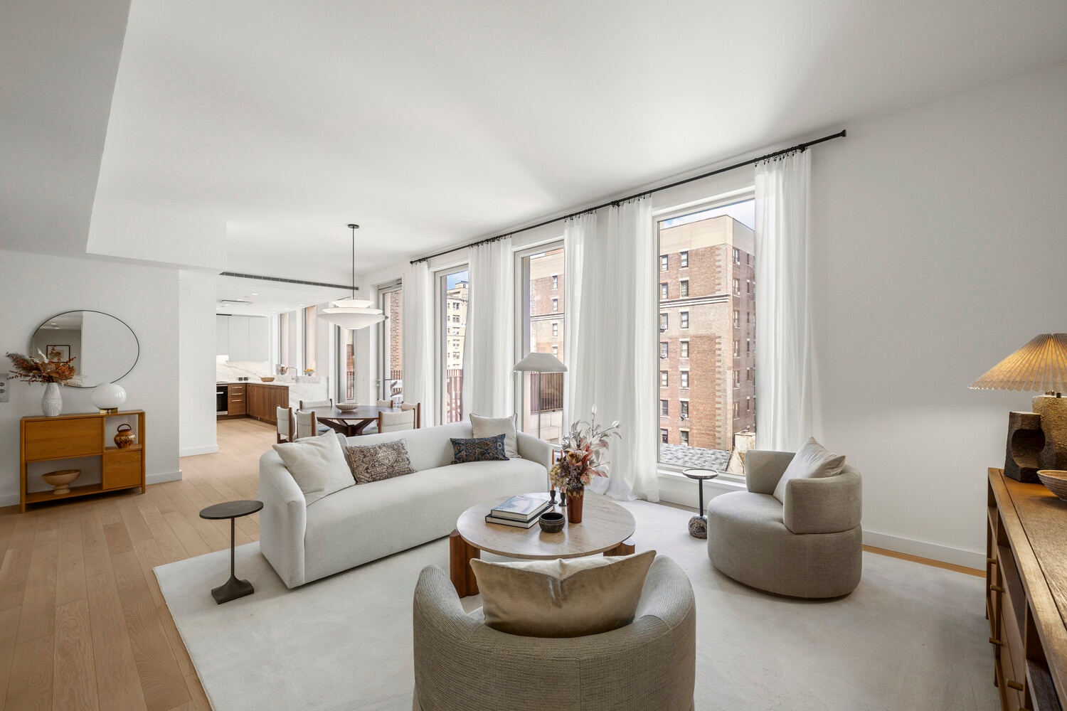 Beyond the dedicated elevator entry and formal foyer is the expansive corner great room with ceiling heights up to 10 feet and floor-to-ceiling windows clad in white oak. The adjacent private terrace provides the perfect opportunity for outdoor entertaining. The centerpiece of the great room is the spectacular kitchen, featuring custom-stained wood and Ghiaccio grey lacquer cabinetry with bevel detailing, hand-selected European high-honed Volakas marble countertops and backsplash, and a best-in-class suite of Miele appliances.
