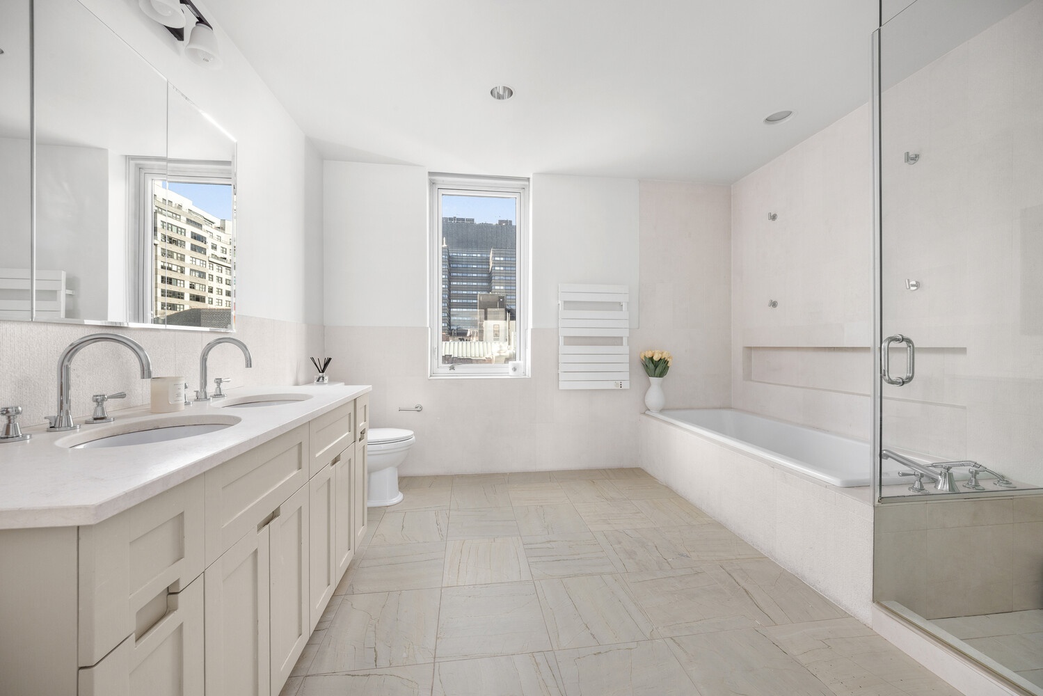 The primary suite serves as a private retreat, featuring dual east and south exposures, a generous walk-in closet, and a windowed spa-like bath with double vanities, soaking tub, Waterworks rain shower, and heated towel rack.