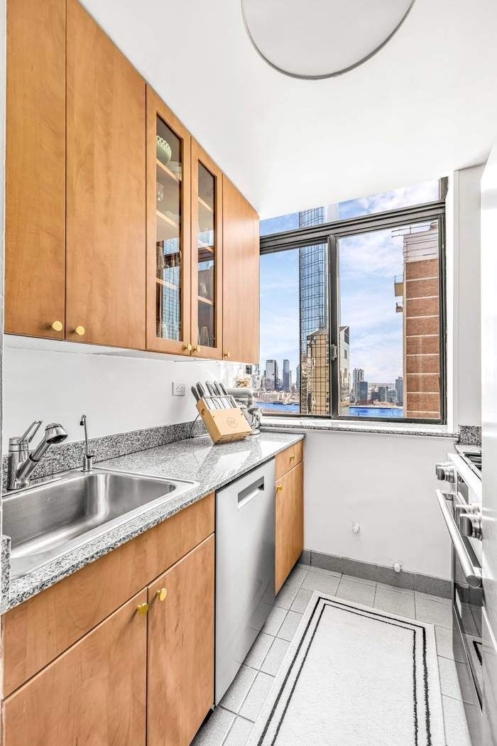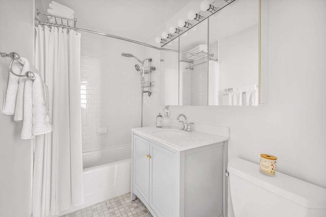The corner primary bedroom is a serene retreat, offering ample storage and sweeping views of the Chrysler Building, Empire State Building, and the East River. It’s the perfect blend of comfort and sophistication. The spacious second bedroom boasts panoramic city skyline views and a cozy nook, ideal for use as a home office. The spa-inspired bathroom features a generous vanity and luxurious marble flooring, offering a tranquil escape within the home.