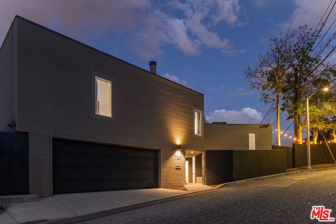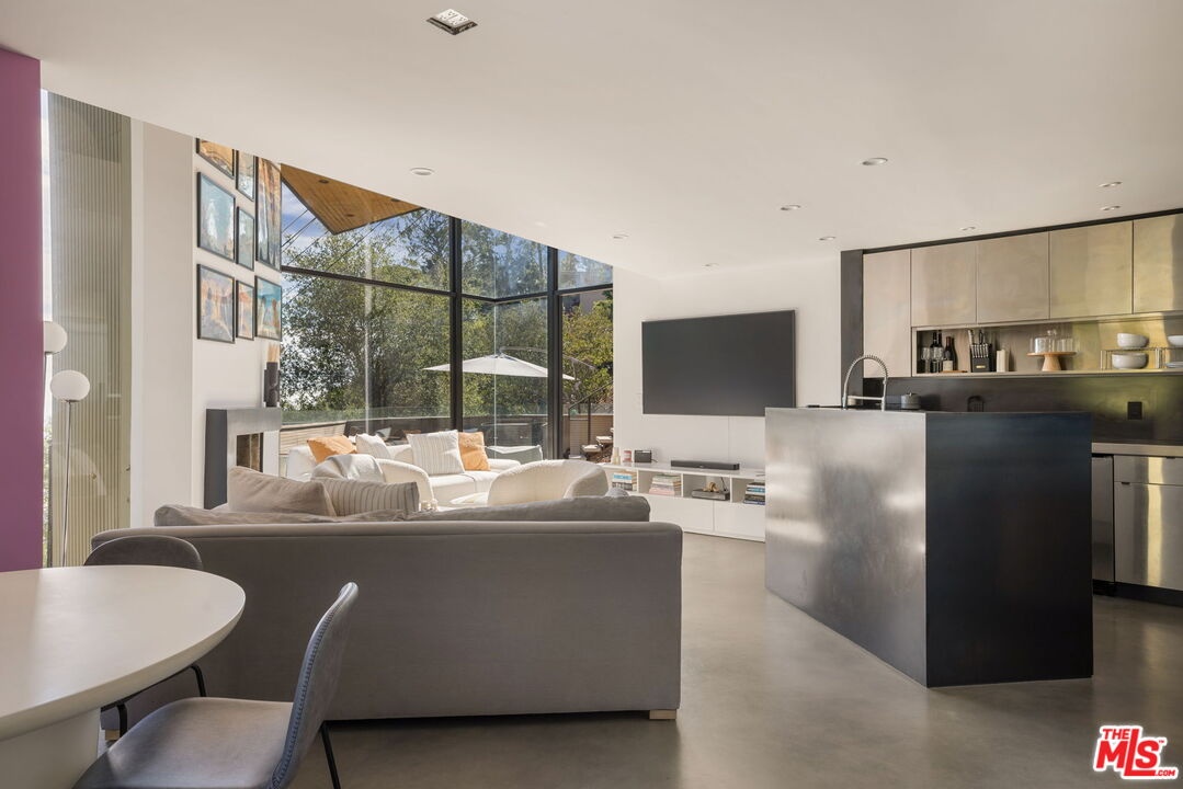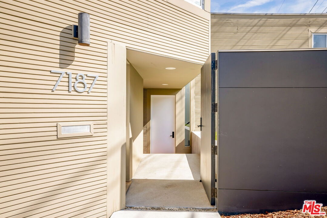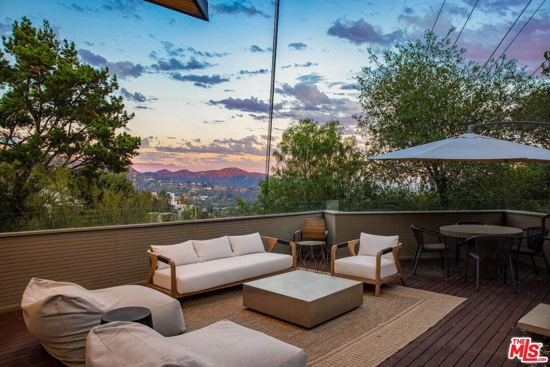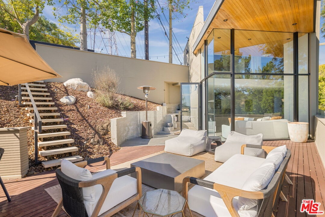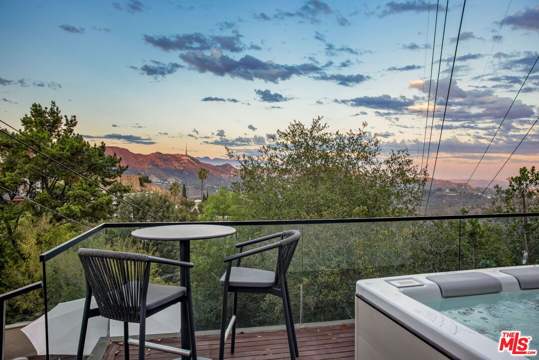 Dramatic Lautner-inspired architecture in the prestigious Outpost Estates. Proudly presenting the George Deutsch Residence. Deutsch worked with Lautner on the world-famous Wolff Residence (1963), quickly becoming enamored with the unique design of Lautner's masterpiece. 7187 Macapa is Deutsch's site-specific, 2/3 scale model of Wolff, Lautner's only homage to his teacher, Frank Lloyd Wright. George Deutsch built his dream home for himself. 7187 Macapa is sited on a rare double wide serenet street in the Hollywood Hills, which culminates in a cul-de-sac. The home is the product of a comprehensive multi-year restoration / modernization. Everything has been considered & meticulously renovated with custom finishes and thoughtful design. The living area boasts polished concrete floors, 16.5 foot ceilings, and walls of glass allowing for seamless indoor/outdoor living. The kitchen has been fitted with Miele appliances and custom blackened and stainless steel cabinetry. Upstairs, the private primary suite, features a considerable walk-in closet, custom wet room concept with teak flooring, rainfall showerhead, ceiling mounted tub filler, and freestanding Badeloft tub. With impeccable design and thoughtfully designed spaces, this property is the perfect retreat from city life for the most discerning collector. Newer Ipe multi-level decks offer abundant space for entertaining and taking in sunsets. Outdoor amenities include a lounge area, fire pit, a jacuzzi, and landscaped terraces. The garage has been converted into a fully equipped ADU. All this, only moments from Runyon Canyon hiking trails, West Hollywood, the Studios, and 101 Freeway.