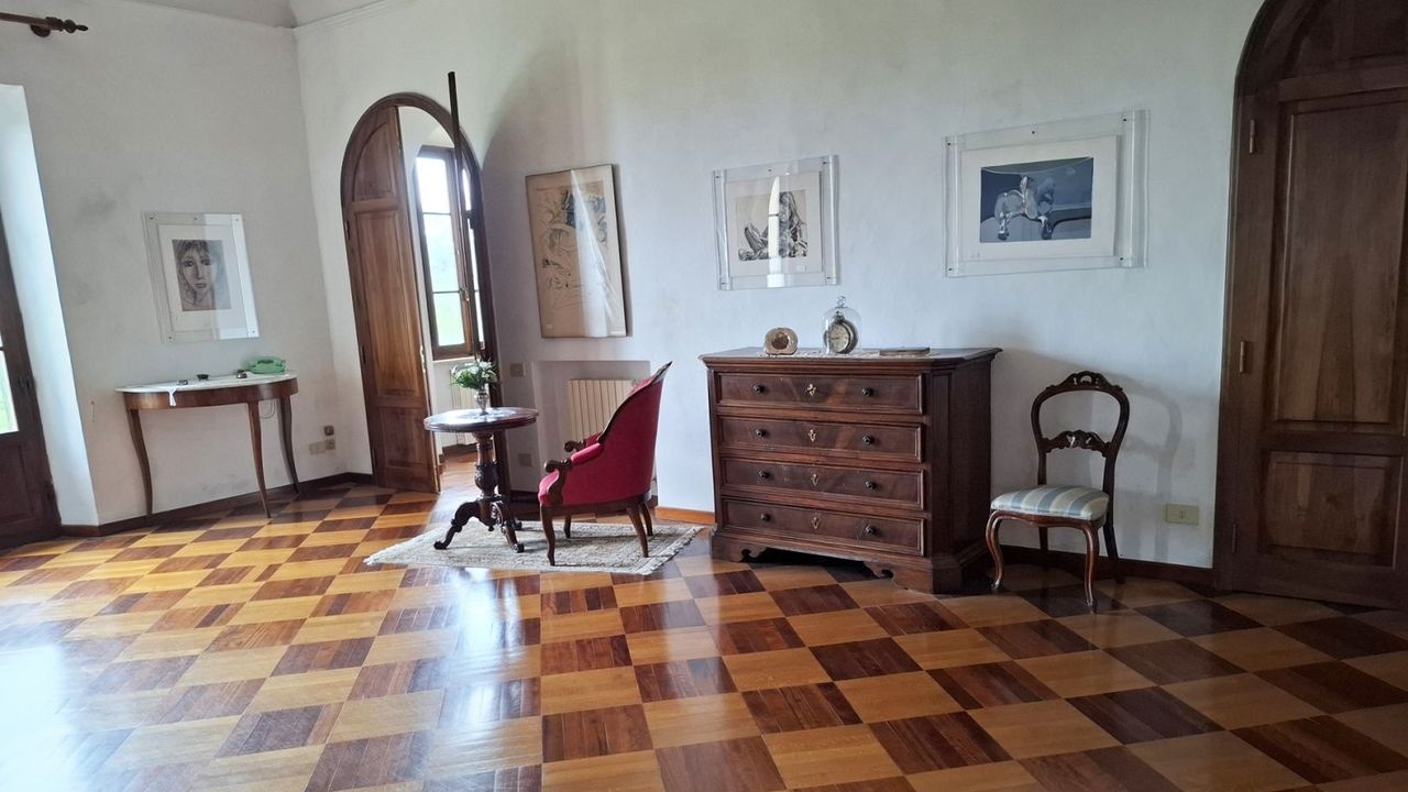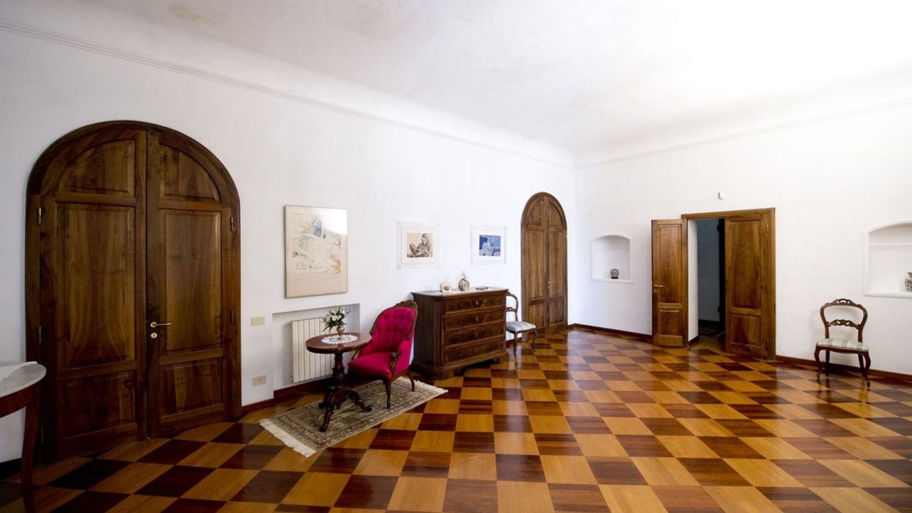 A majestic staircase leads to the main entrance, which opens onto an elegant atrium, two splendid halls (one of which has a fireplace) with original terracotta floors and exposed-beam ceilings, a period kitchen, a traditional working fireplace, a living room and a study with bathroom. From this floor there is access to the basement cellar.