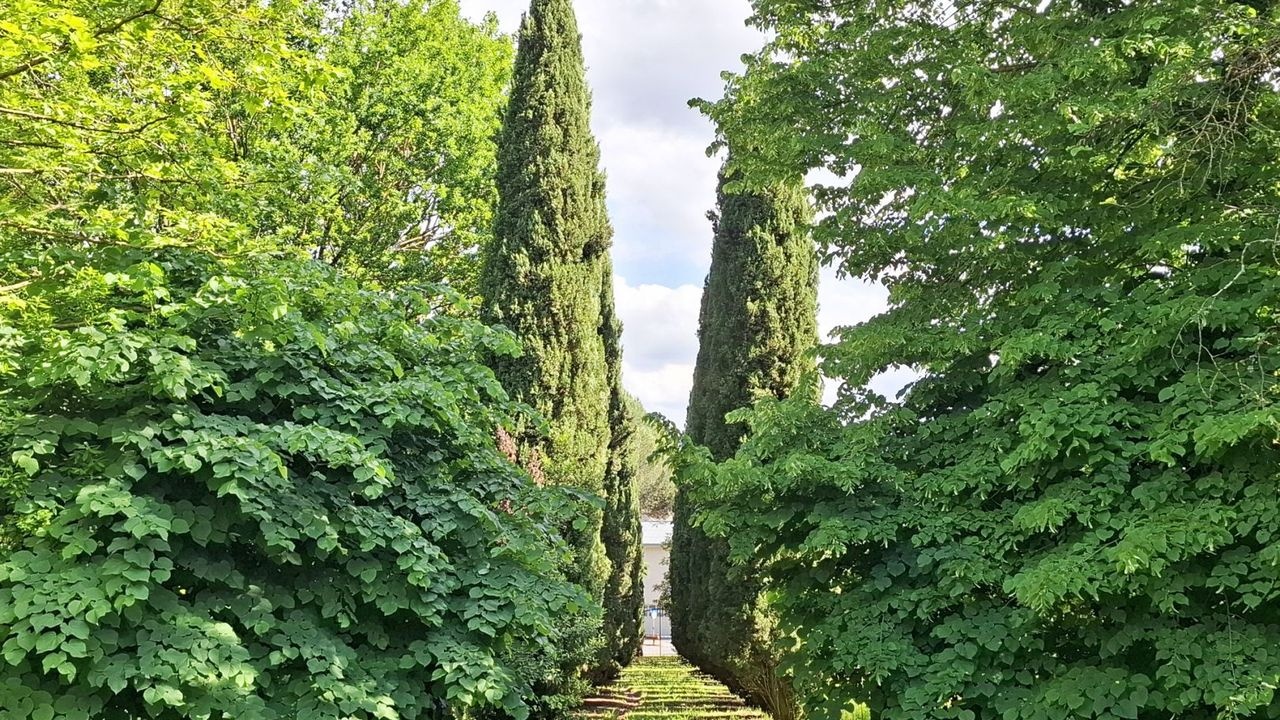 Access to the property is provided by three private driveways, including a long avenue of cypress trees and a large outdoor car park.