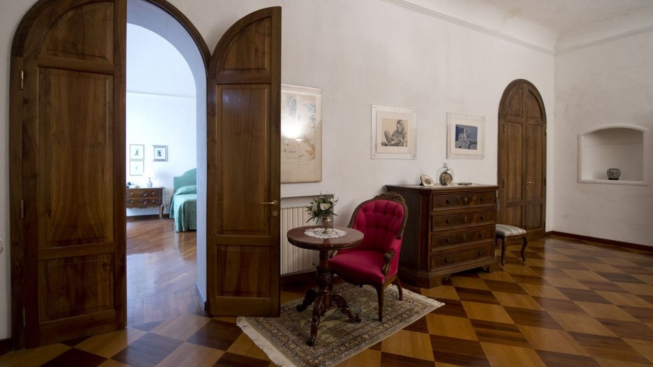 A large brick staircase leads to the upper floor, which houses a large bright living room with balcony and an elegant chequered parquet floor and the sleeping area with parquet floors and exposed-beam ceilings, consisting of three large bedrooms with en-suite bathrooms.