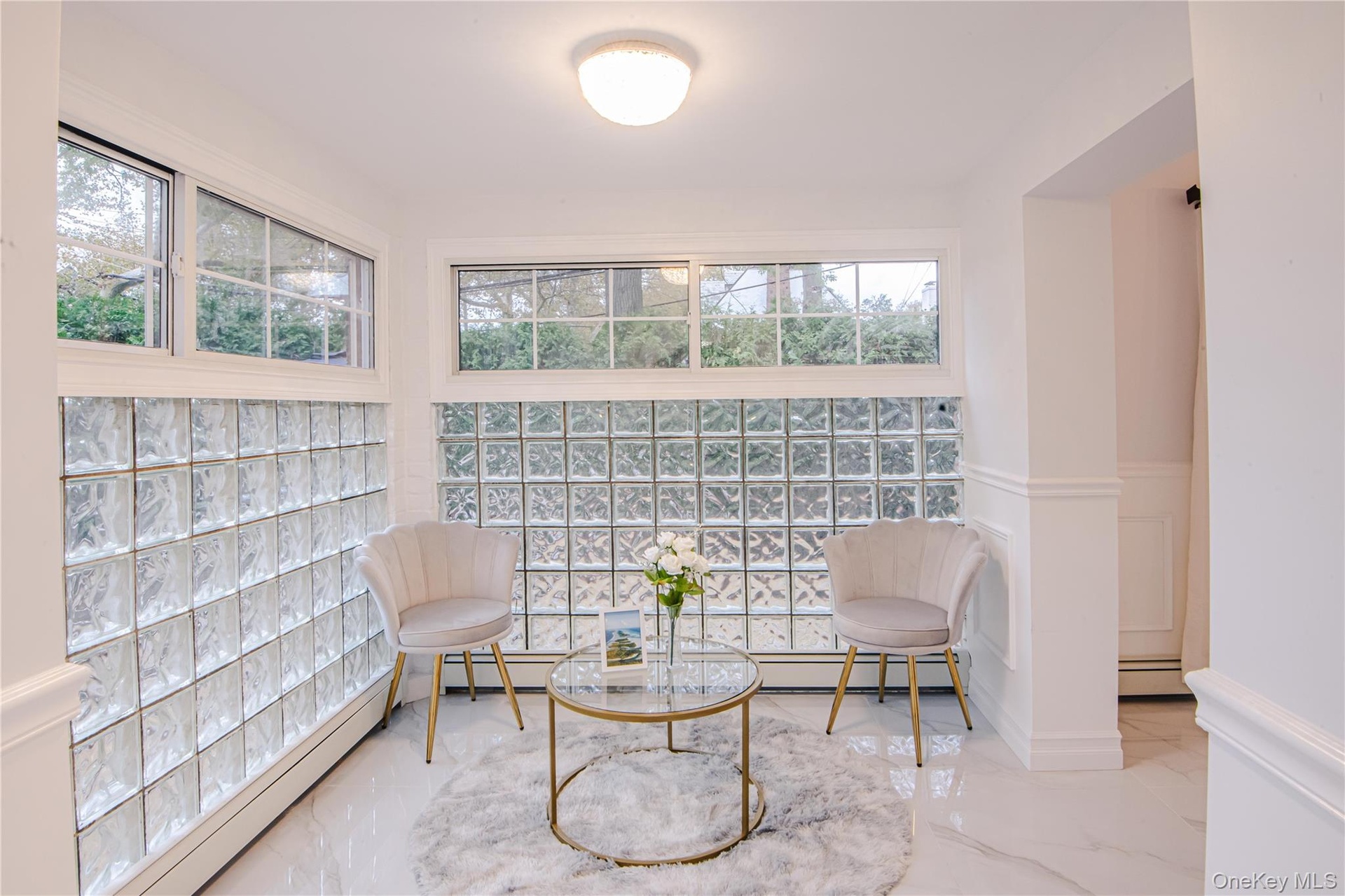 Adjacent to the living room, the sunroom is surrounded by glass block windows and overlooks the beautifully landscaped backyard, providing a serene space to unwind and enjoy natural sunlight year-round. A first-floor bedroom with an adjacent full bath completes the main level, offering flexibility for guests, a home office, au pair suite, or playroom.