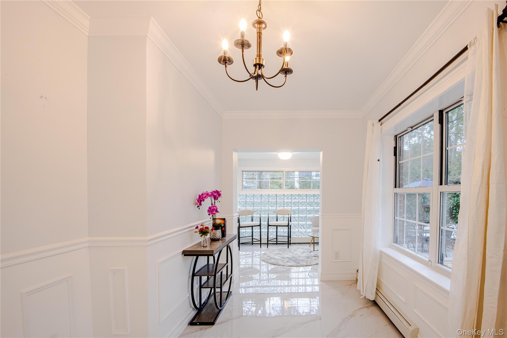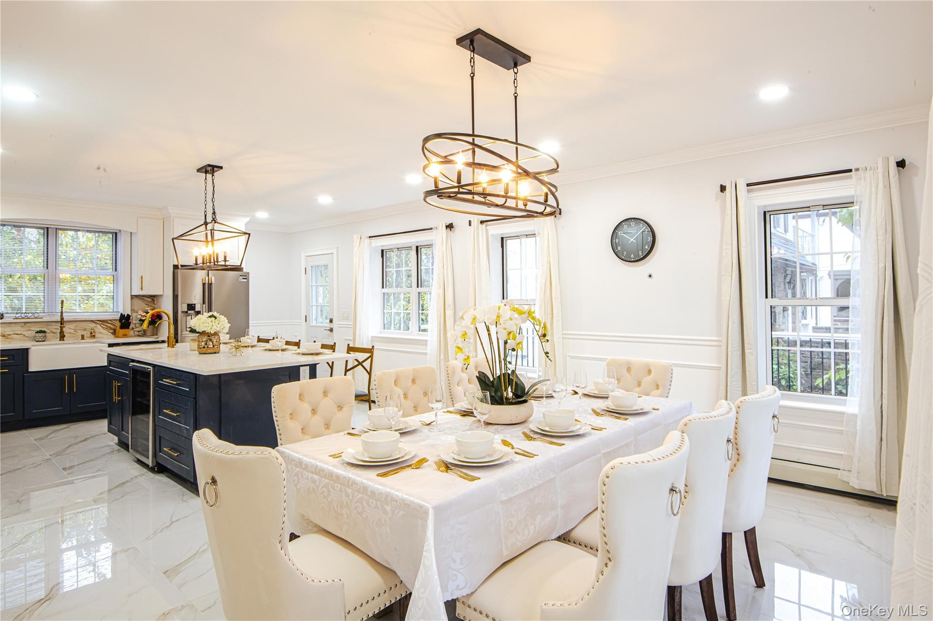 Step through the inviting foyer and mudroom into a bright and welcoming living room highlighted by a wood-burning fireplace, luxurious chandelier, and oversized windows that fill the space with abundant natural light. The home showcases crown molding, wainscoting panel wall design, recessed lighting, and smart thermostats, along with modern porcelain tiles and hardwood floors flowing seamlessly throughout—creating an atmosphere of both sophistication and comfort.