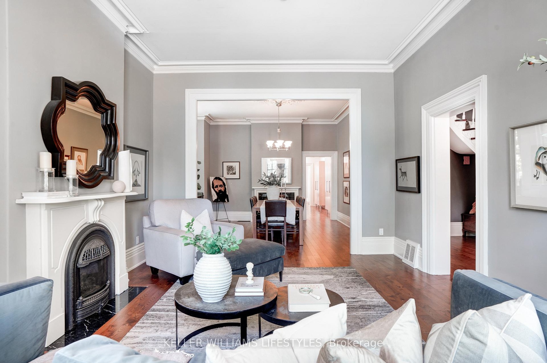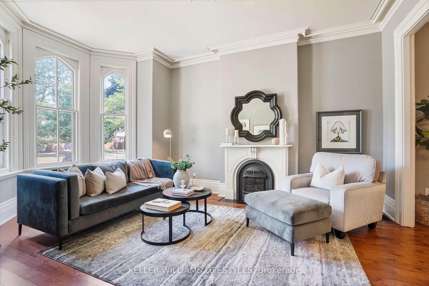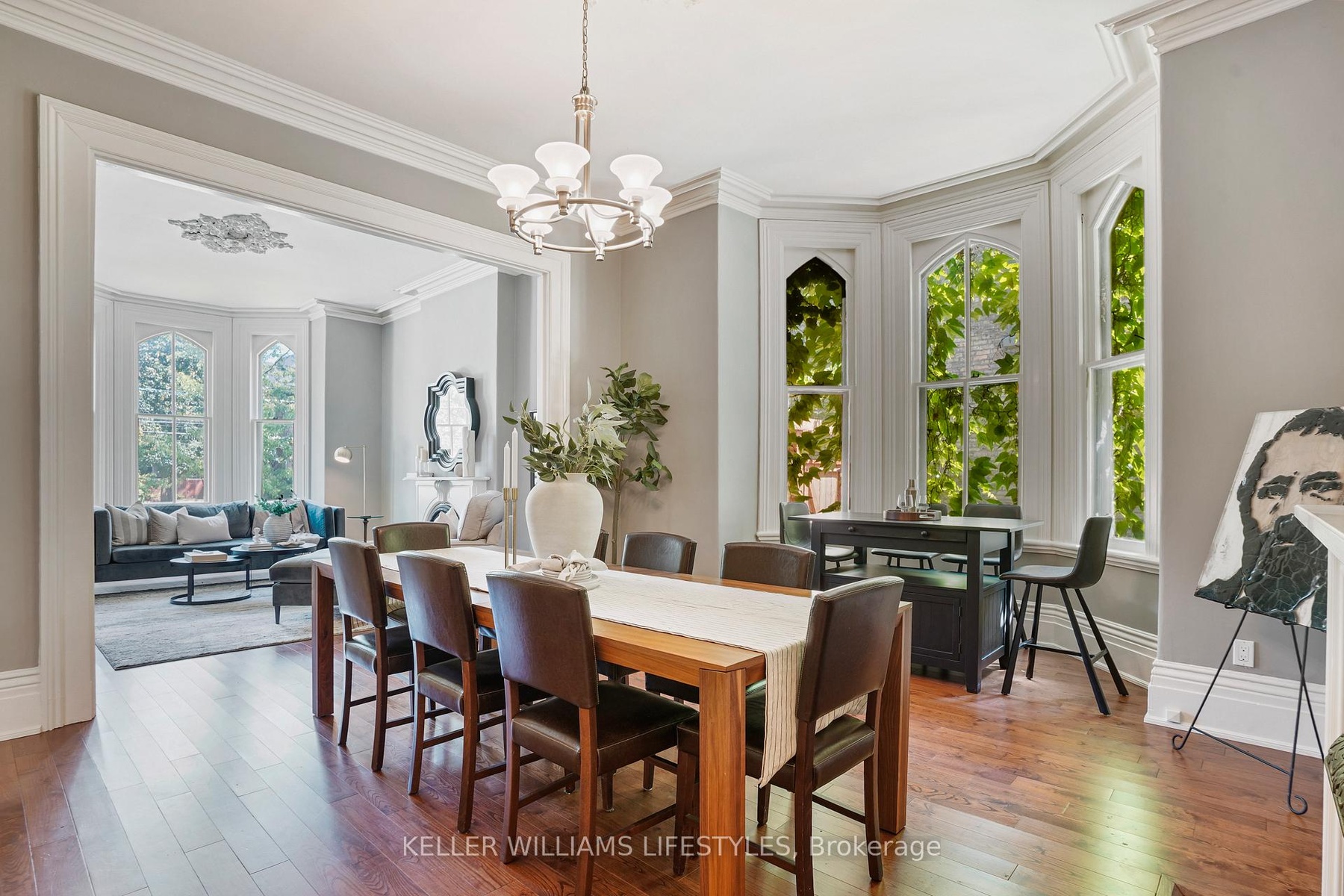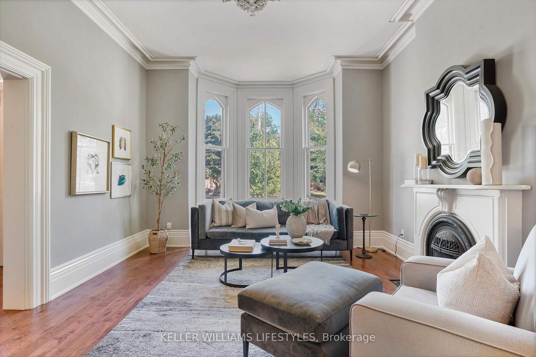 Discover a masterpiece in the heart of the prestigious Woodfield district. This magnificent home offers an unparalleled fusion of historic elegance and sophisticated modern living. With over 2,700 sq. ft. of exquisitely finished space AG, this 4-bedroom residence is a testament to timeless character and thoughtful renovation. Step through the grand double doors into a breathtaking foyer where a majestic staircase and soaring ceilings set a tone of classic grandeur. The main floor is an entertainer's dream, featuring a formal living room with a decorative fireplace and a spacious dining room, both adorned with intricate crown moulding and rich hardwood floors. The heart of the home is the stunning, fully renovated kitchen, which boasts leathered countertops, premium stainless-steel appliances, a large centre island, and seamless flow into the cozy family room. This level also provides exceptional flexibility with a dedicated home office and convenient main floor laundry. Upstairs, the private quarters include four generous bedrooms. The serene primary suite is a true retreat, featuring a spa-like ensuite bathroom with a glass-enclosed shower, and a modern double vanity. An open loft area on this level provides another versatile space for work or relaxation. The finished lower level adds a large recreation room. Outside, the property sits on a beautifully landscaped lot with a long, interlocking stone driveway providing ample parking. The private, fenced backyard offers a tranquil escape within the city. Situated on a mature, tree-lined street, this home is just steps from the vibrant culture of downtown London, Richmond Row's boutiques and restaurants, and beautiful Victoria Park. Its prime location also offers an effortless commute to Western University and London's major hospital campuses. Families who want to ensure a priority in academics can rest easy knowing they are situated within boundaries of top schools like Central SS, Banting FI & CCH & MTS FI.