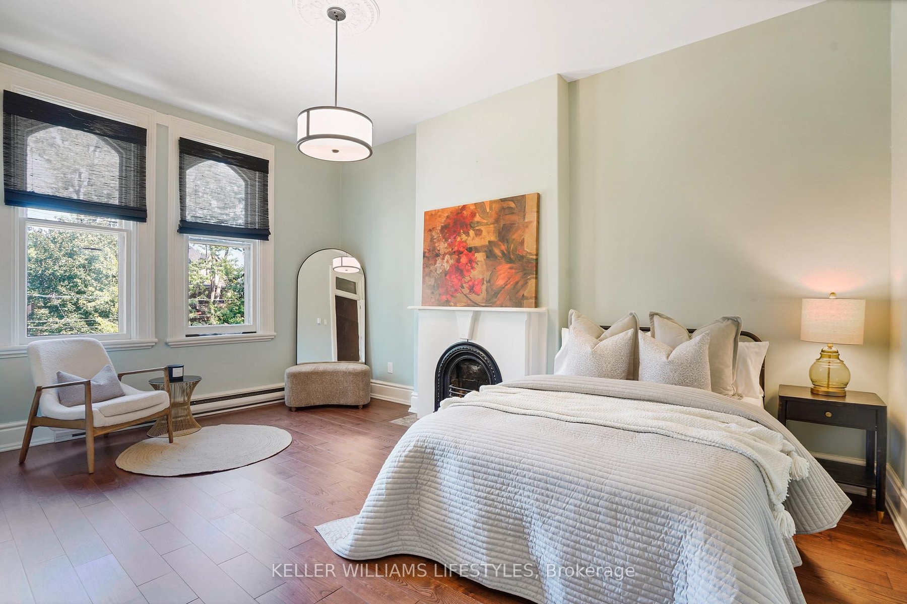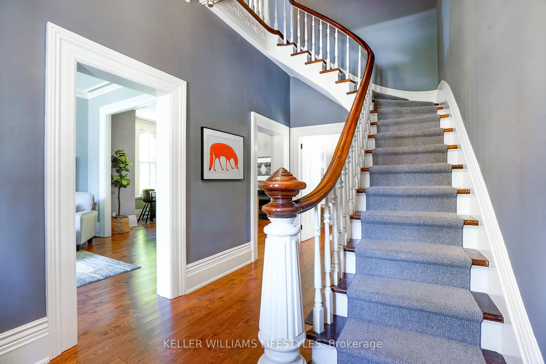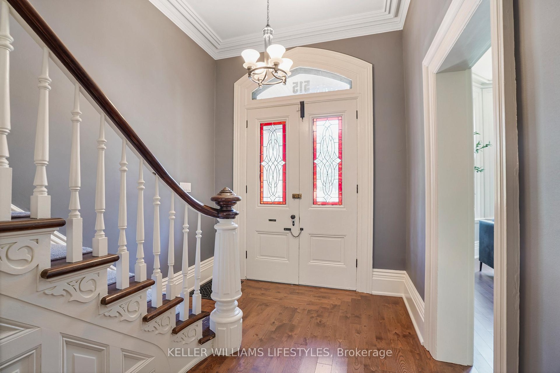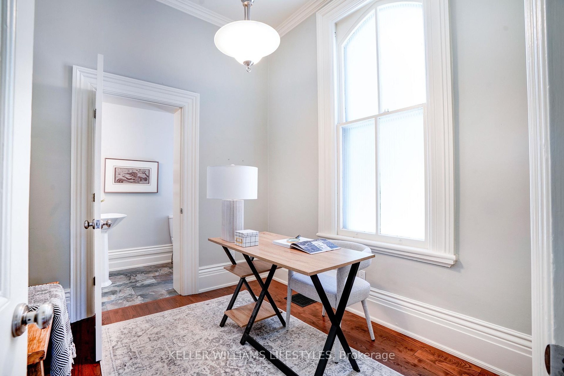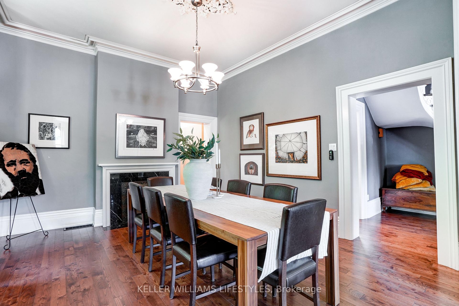 Discover a masterpiece in the heart of the prestigious Woodfield district. This magnificent home offers an unparalleled fusion of historic elegance and sophisticated modern living. With over 2,700 sq. ft. of exquisitely finished space AG, this 4-bedroom residence is a testament to timeless character and thoughtful renovation. Step through the grand double doors into a breathtaking foyer where a majestic staircase and soaring ceilings set a tone of classic grandeur. The main floor is an entertainer's dream, featuring a formal living room with a decorative fireplace and a spacious dining room, both adorned with intricate crown moulding and rich hardwood floors. The heart of the home is the stunning, fully renovated kitchen, which boasts leathered countertops, premium stainless-steel appliances, a large centre island, and seamless flow into the cozy family room. This level also provides exceptional flexibility with a dedicated home office and convenient main floor laundry. Upstairs, the private quarters include four generous bedrooms. The serene primary suite is a true retreat, featuring a spa-like ensuite bathroom with a glass-enclosed shower, and a modern double vanity. An open loft area on this level provides another versatile space for work or relaxation. The finished lower level adds a large recreation room. Outside, the property sits on a beautifully landscaped lot with a long, interlocking stone driveway providing ample parking. The private, fenced backyard offers a tranquil escape within the city. Situated on a mature, tree-lined street, this home is just steps from the vibrant culture of downtown London, Richmond Row's boutiques and restaurants, and beautiful Victoria Park. Its prime location also offers an effortless commute to Western University and London's major hospital campuses. Families who want to ensure a priority in academics can rest easy knowing they are situated within boundaries of top schools like Central SS, Banting FI & CCH & MTS FI.