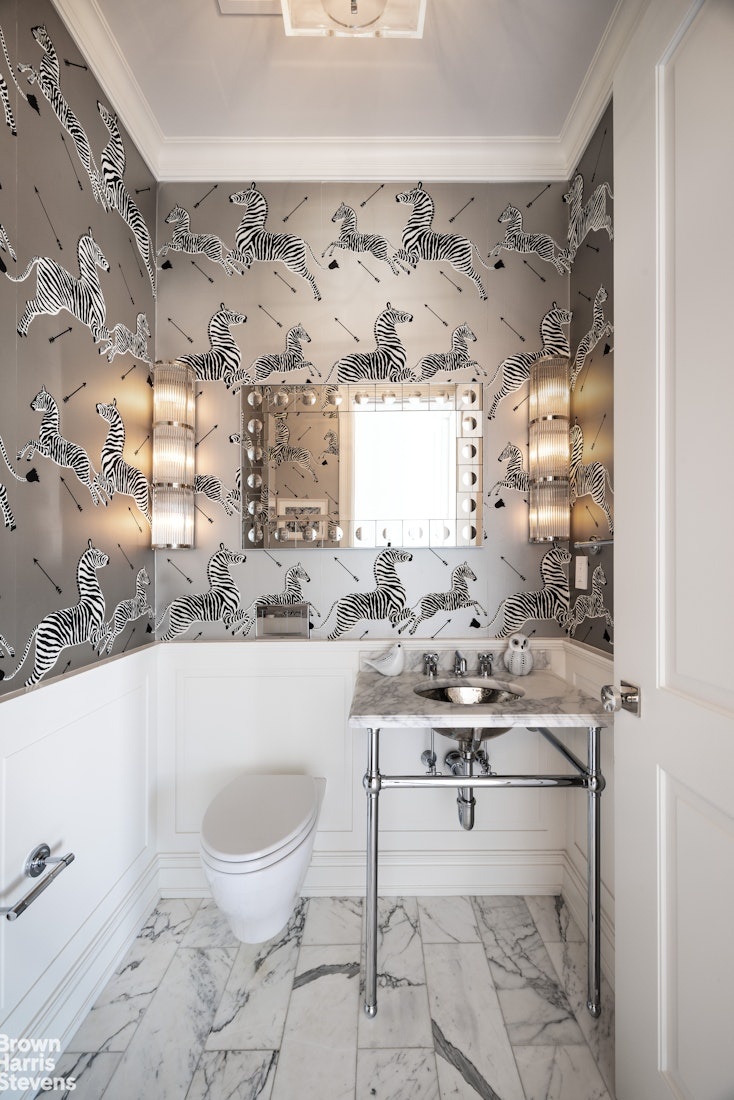 On the upper floor, a sun-soaked primary bedroom occupies the prime corner and includes one of the most attractive and thoughtful, custom walk-in closets imaginable, naturally with a window of its own. A luxurious and windowed primary bathroom is outfitted with Waterworks fixtures, Italian Calacatta and Arctic gray marble, and a freestanding soaking tub, as well as a ribbed-glass enclosed shower and separate enclosed Toto toilet. Additional closets and storage were added throughout this suite. The windows face north and west towards Central Park and the Central Park West skyline. Two of the three additional bedrooms, each with an ensuite marble and Waterworks bathroom, face north, while the fourth bedroom nestles at the opposite corner and benefits from north and east exposure. The upper floor is further accented by the 11-foot ceilings.