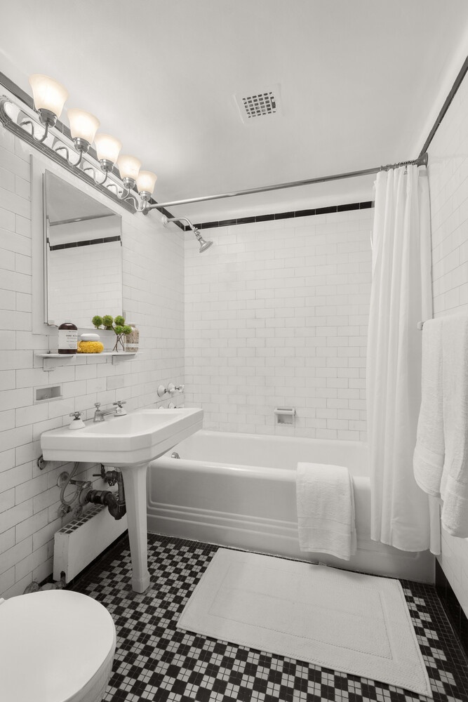 A dressing area off the bathroom provides ample built-in storage, while the original mosaic tile flooring, pedestal sink, cast-iron soaking tub, and medicine cabinet preserve the building's timeless pre-war character.