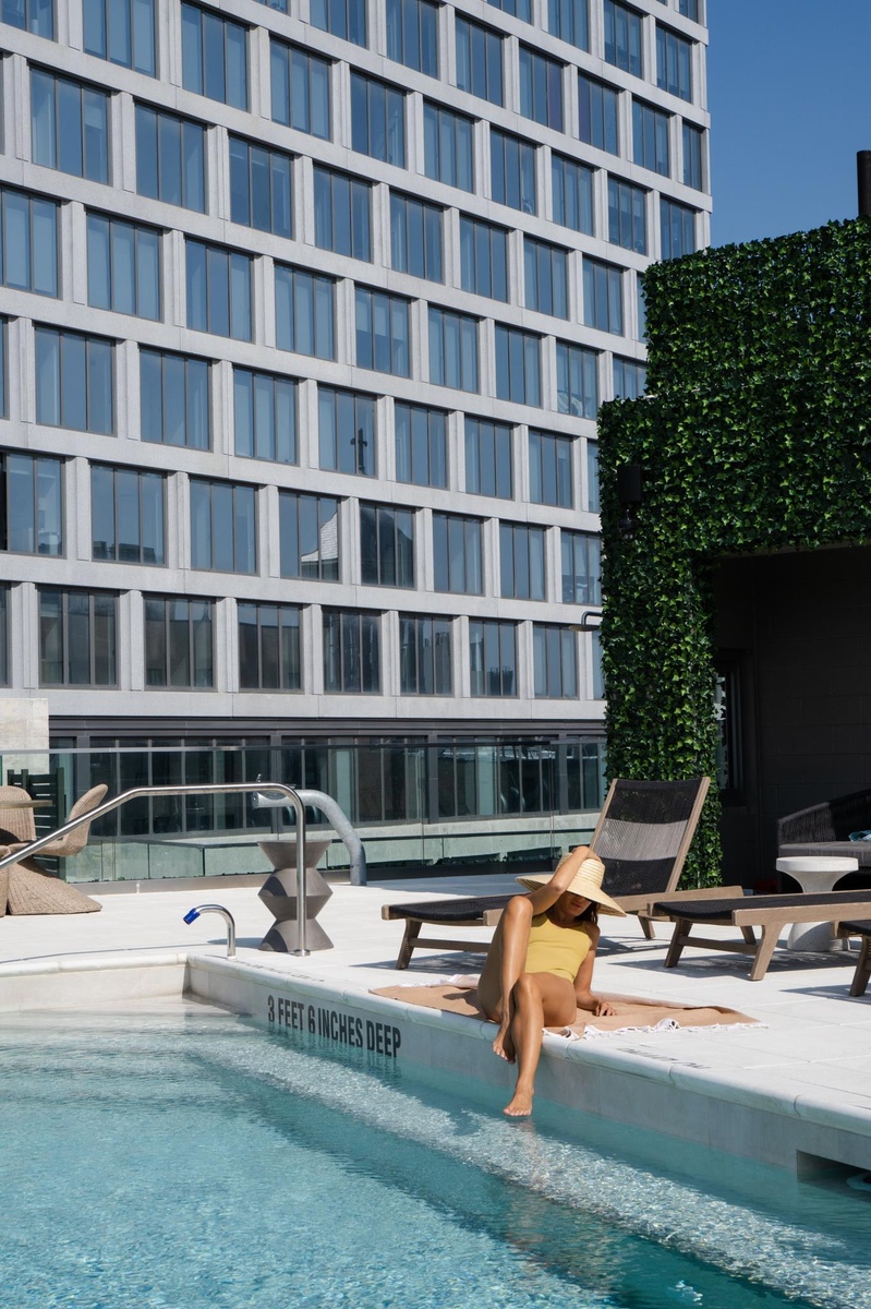The building's amenities include a bright fitness center, game room, golf simulator, coworking lounge, conference rooms, rooftop sun deck, and a private outdoor pool located on the fifth floor. The building also offers bike storage, and private storage cages for rent– with a door person present seven days a week from 11AM to 7PM.