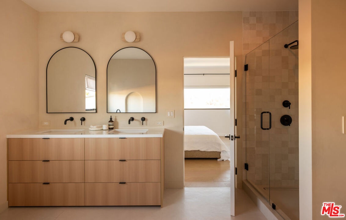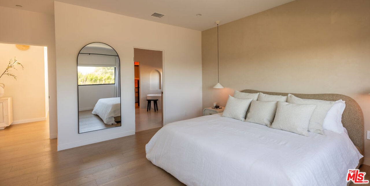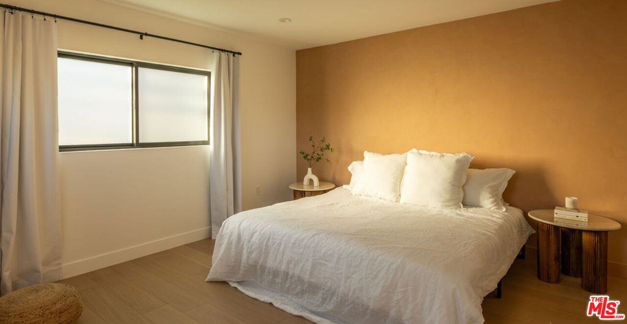 Welcome to a modern sanctuary created and built as a personal residence by a husband and wife team, she an interior designer and he a fashion producer. Every aspect of this immaculate ground-up home was professionally designed with purpose, merging craftsmanship, light, and calm in perfect balance. The kitchen's bountiful custom white-oak cabinetry anchors the room with clean geometry, complemented by handmade Zellige tile that add texture and warmth. Natural light moves gracefully through 16-foot vaulted ceilings, revealing a palette of soft Roman clay and warm wood. The main living space opens effortlessly to the lush backyard with mature landscaping, where indoor and outdoor living blend seamlessly. The open concept flow feels intuitive, with spaces that invite gathering and quiet in equal measure. Throughout the home, thoughtful details like Visual Comfort lighting and subtle stone accents create an atmosphere that feels elevated yet understated. The powder room's Calacatta Viola marble sink and custom wood stair treads and risers bring a sense of craftsmanship to the home's vertical movement. A detached guest suite with its own kitchen and bath offers flexibility for guests, a live-in nanny, an in-law suite, creative use, or additional income, maintaining privacy without disrupting the architectural harmony of the main residence. The private backyard and spacious roof deck lend themselves to endless outdoor dining and entertaining opportunities. Every detail has been thoughtfully curated, resulting in an unparalleled functional and refined design. Seldom does a home that embodies this emotion and eminence become available. Whether hosting a dinner party or simply lounging with family and friends, this bespoke home is the perfect place to call home. Set on one of the most convenient and neighborly streets in West Los Angeles, this home offers easy access to the beach and all West LA has to offer, yet sits quietly on a wide, no-through street where kids still learn to ride bikes. A residence of light, material, and intention designed to not only impress, but be lived in.