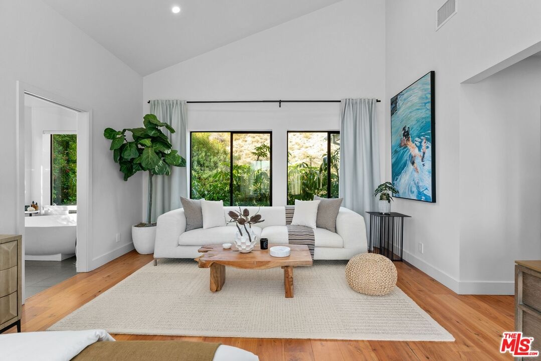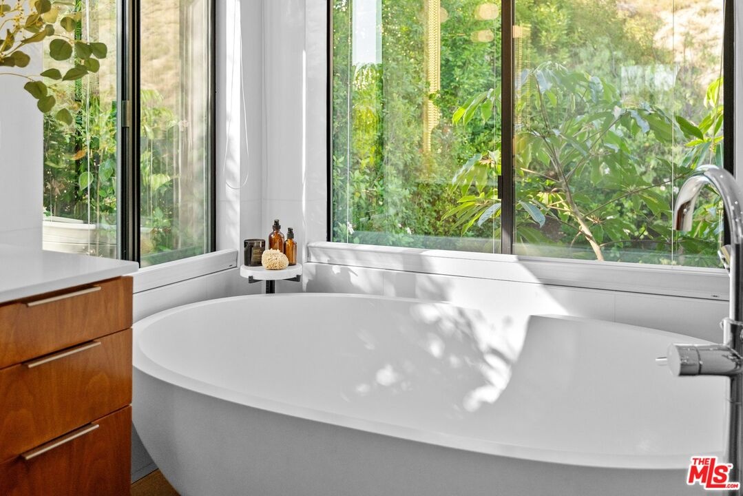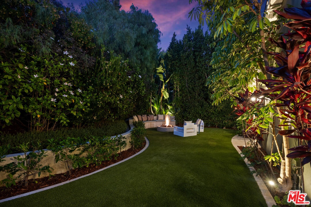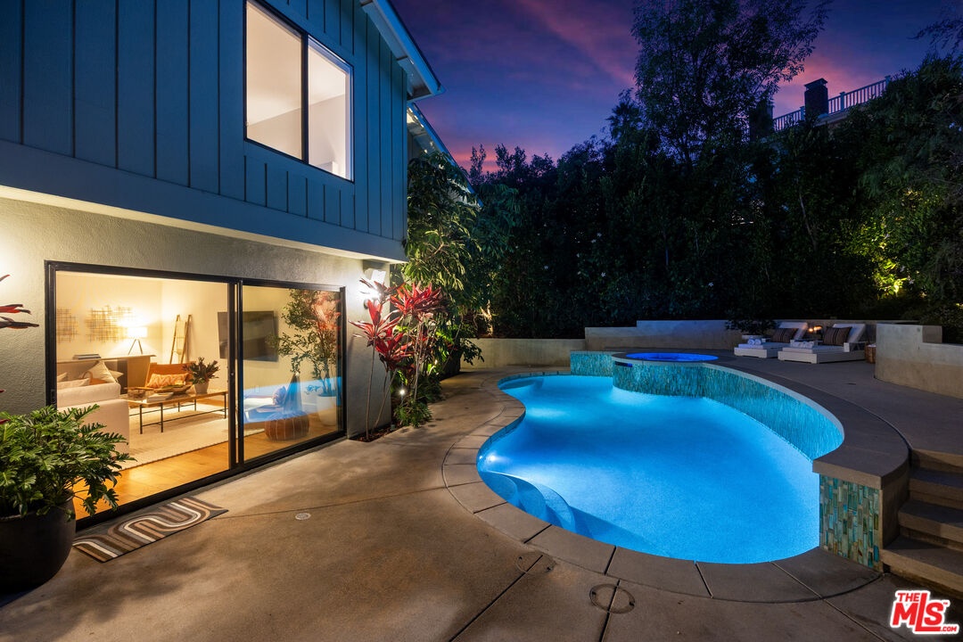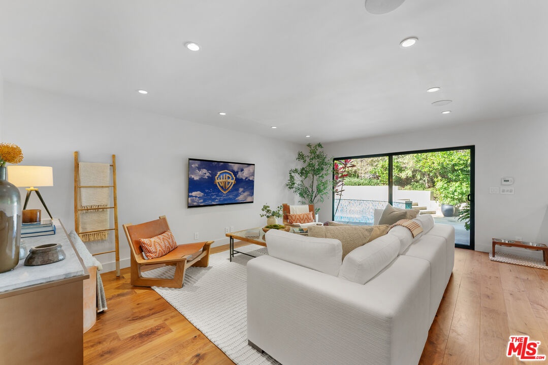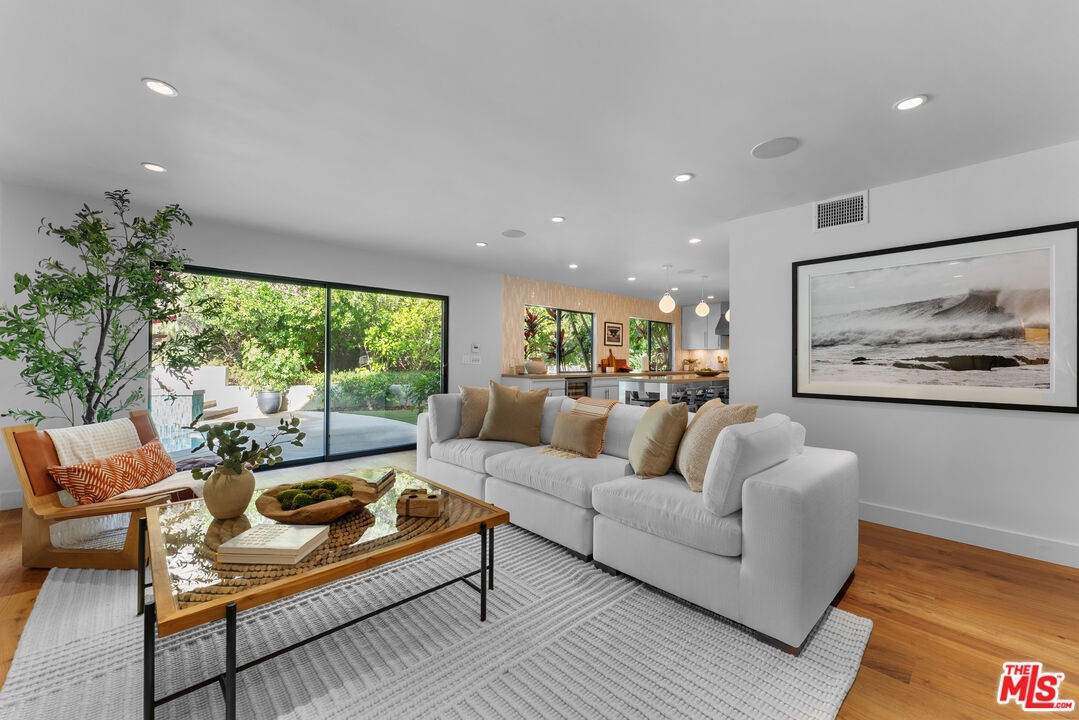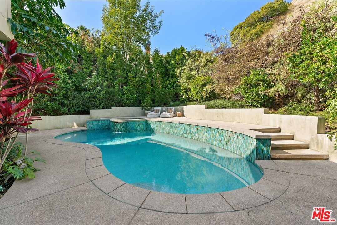 This stunning 5-bedroom, 4-bathroom Lake Hollywood residence has been completely reimagined by renowned designers Vaughan Benz, blending modern sophistication, family functionality, and timeless California style. Nestled just below the iconic Hollywood Sign on a quiet cul-de-sac, the home sits on a wide, sidewalk-lined street with ample parking - an ideal setting for families and gatherings. A private gated courtyard introduces the property with lush greenery, and tranquil seating areas before opening to a light-filled two-story layout. Inside, North American walnut hardwood floors, custom lighting, and tailored finishes create an inviting, contemporary atmosphere. The expansive family room serves as the heart of the home, flowing seamlessly into a chef's kitchen equipped with a Wolf range, a wine fridge, walk-in pantry, and a generous center island with casual eat-in dining. Perfect for everyday living and entertaining, this space connects effortlessly through walls of glass to the resort-style backyard. Step outside to a garden sanctuary designed by landscape designer Steve Silva - a private oasis with sparkling pool and spa featuring a waterfall, built-in fire pit, fruit trees, herb garden, and low-maintenance turf lawn. Whether hosting friends or relaxing under the stars, this outdoor retreat was made for connection and calm tranquility. Upstairs, the luxurious primary suite offers sweeping views, an oversized walk-in closet, and a spa-inspired bath with Apaiser soaking tub, dual vanities, glass shower, and Seura TV mirror. Four additional bedrooms and three beautifully designed baths provide generous space for family and guests. Additional highlights include a built-in stereo system, a spacious laundry room with custom cabinetry, and a direct-entry two-car garage. Located minutes from the 101, major studios, the Hollywood Bowl, and scenic Lake Hollywood trails, this newly remodeled home offers the perfect balance of luxury, lifestyle, and Los Angeles living beneath one of the city's most legendary landmarks.