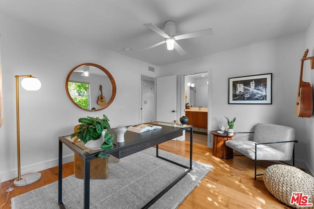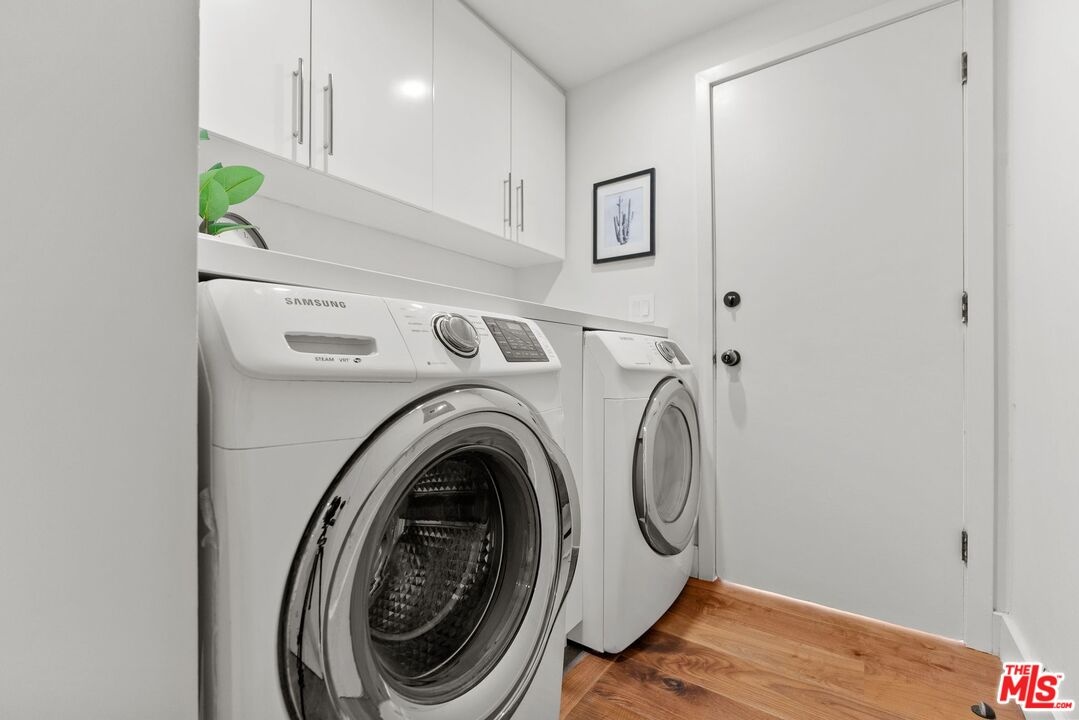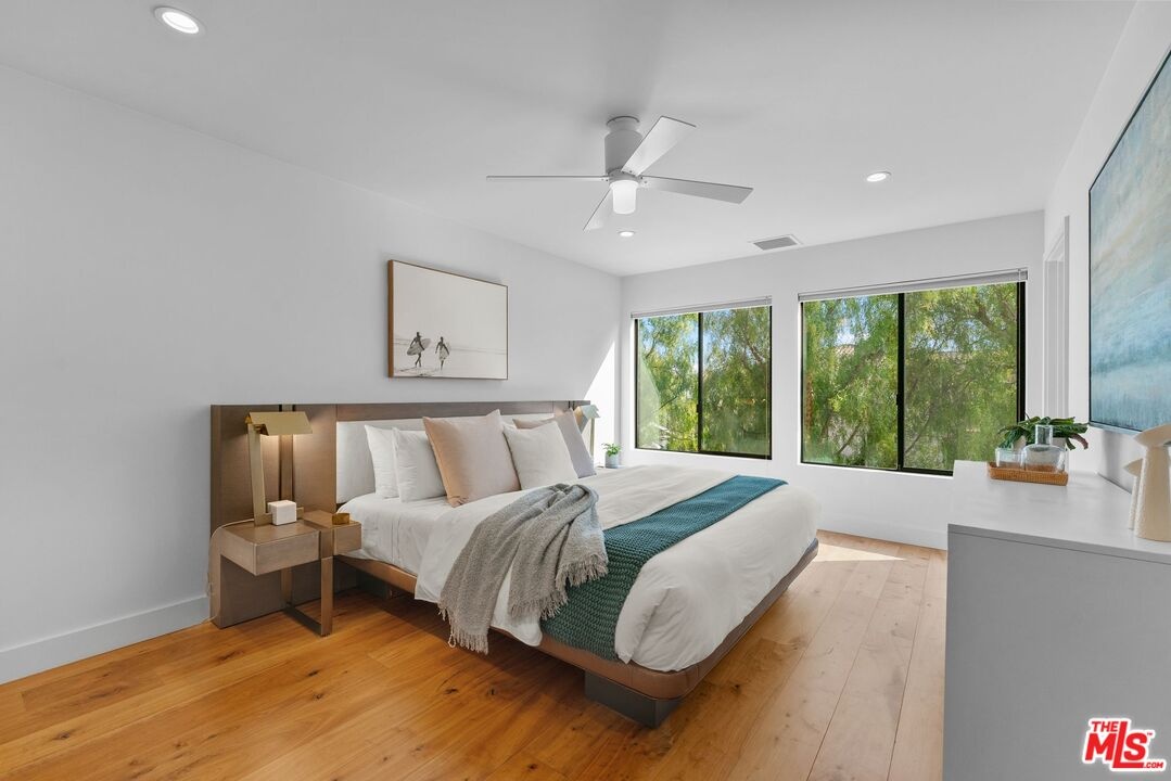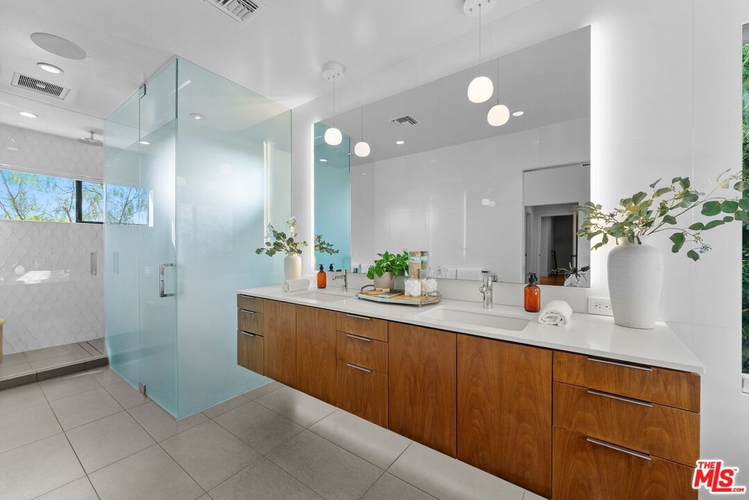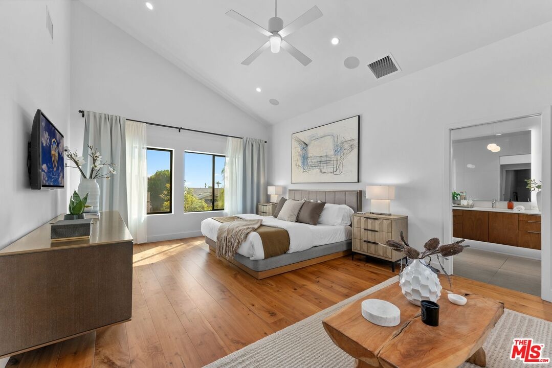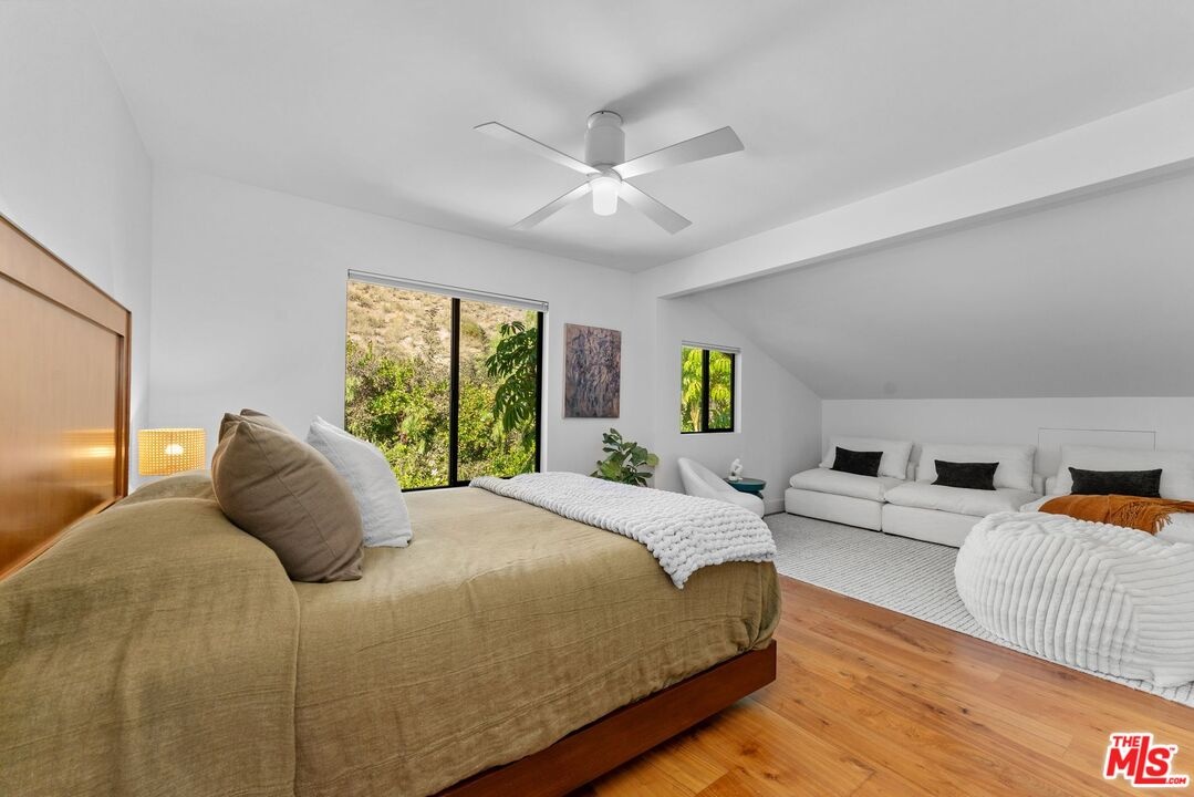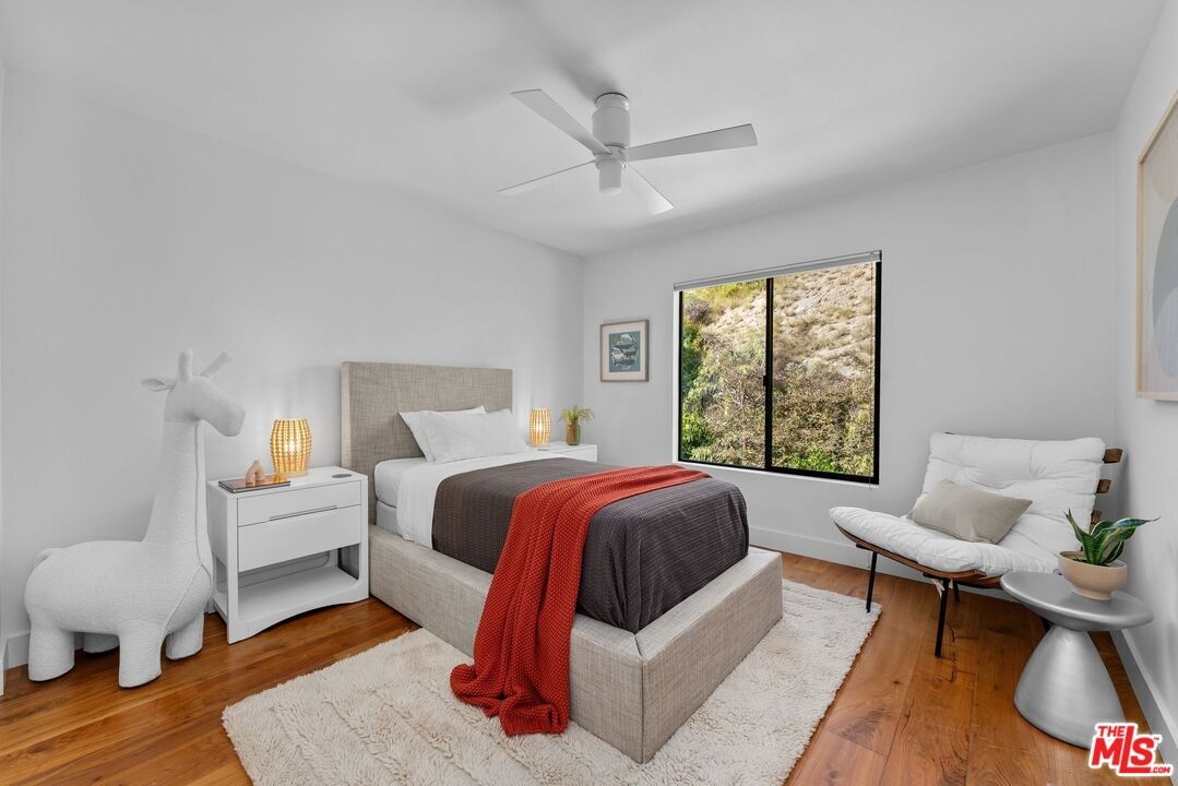 This stunning 5-bedroom, 4-bathroom Lake Hollywood residence has been completely reimagined by renowned designers Vaughan Benz, blending modern sophistication, family functionality, and timeless California style. Nestled just below the iconic Hollywood Sign on a quiet cul-de-sac, the home sits on a wide, sidewalk-lined street with ample parking - an ideal setting for families and gatherings. A private gated courtyard introduces the property with lush greenery, and tranquil seating areas before opening to a light-filled two-story layout. Inside, North American walnut hardwood floors, custom lighting, and tailored finishes create an inviting, contemporary atmosphere. The expansive family room serves as the heart of the home, flowing seamlessly into a chef's kitchen equipped with a Wolf range, a wine fridge, walk-in pantry, and a generous center island with casual eat-in dining. Perfect for everyday living and entertaining, this space connects effortlessly through walls of glass to the resort-style backyard. Step outside to a garden sanctuary designed by landscape designer Steve Silva - a private oasis with sparkling pool and spa featuring a waterfall, built-in fire pit, fruit trees, herb garden, and low-maintenance turf lawn. Whether hosting friends or relaxing under the stars, this outdoor retreat was made for connection and calm tranquility. Upstairs, the luxurious primary suite offers sweeping views, an oversized walk-in closet, and a spa-inspired bath with Apaiser soaking tub, dual vanities, glass shower, and Seura TV mirror. Four additional bedrooms and three beautifully designed baths provide generous space for family and guests. Additional highlights include a built-in stereo system, a spacious laundry room with custom cabinetry, and a direct-entry two-car garage. Located minutes from the 101, major studios, the Hollywood Bowl, and scenic Lake Hollywood trails, this newly remodeled home offers the perfect balance of luxury, lifestyle, and Los Angeles living beneath one of the city's most legendary landmarks.