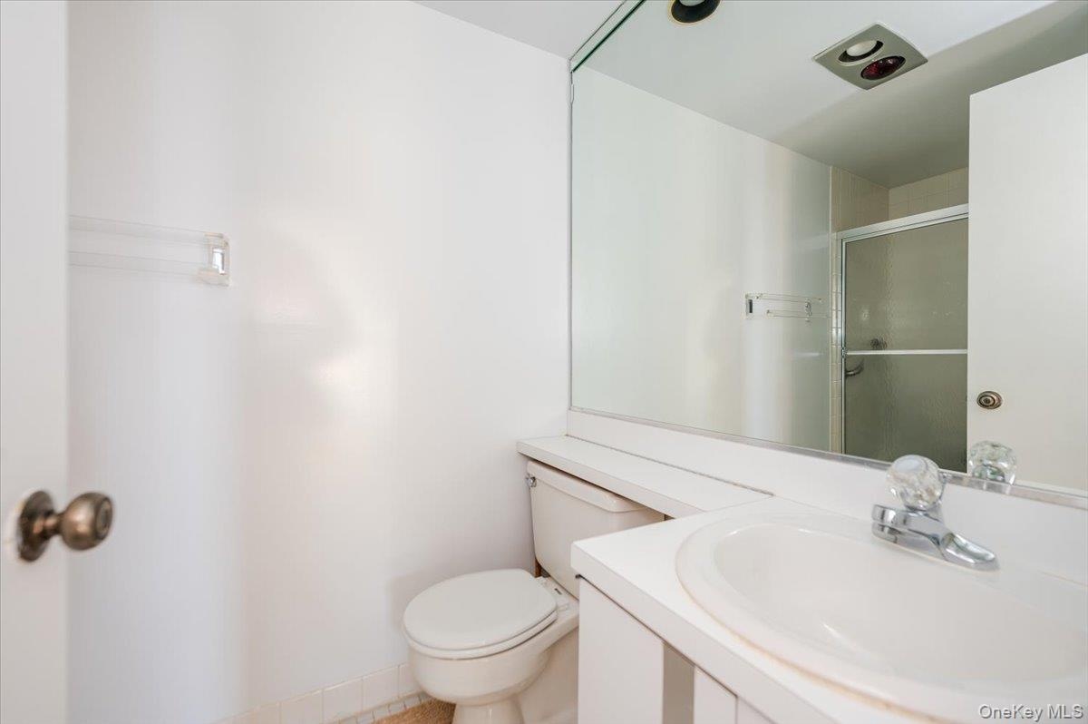 - Full bathroom featuring a shower stall, vanity, and light tile patterned flooring