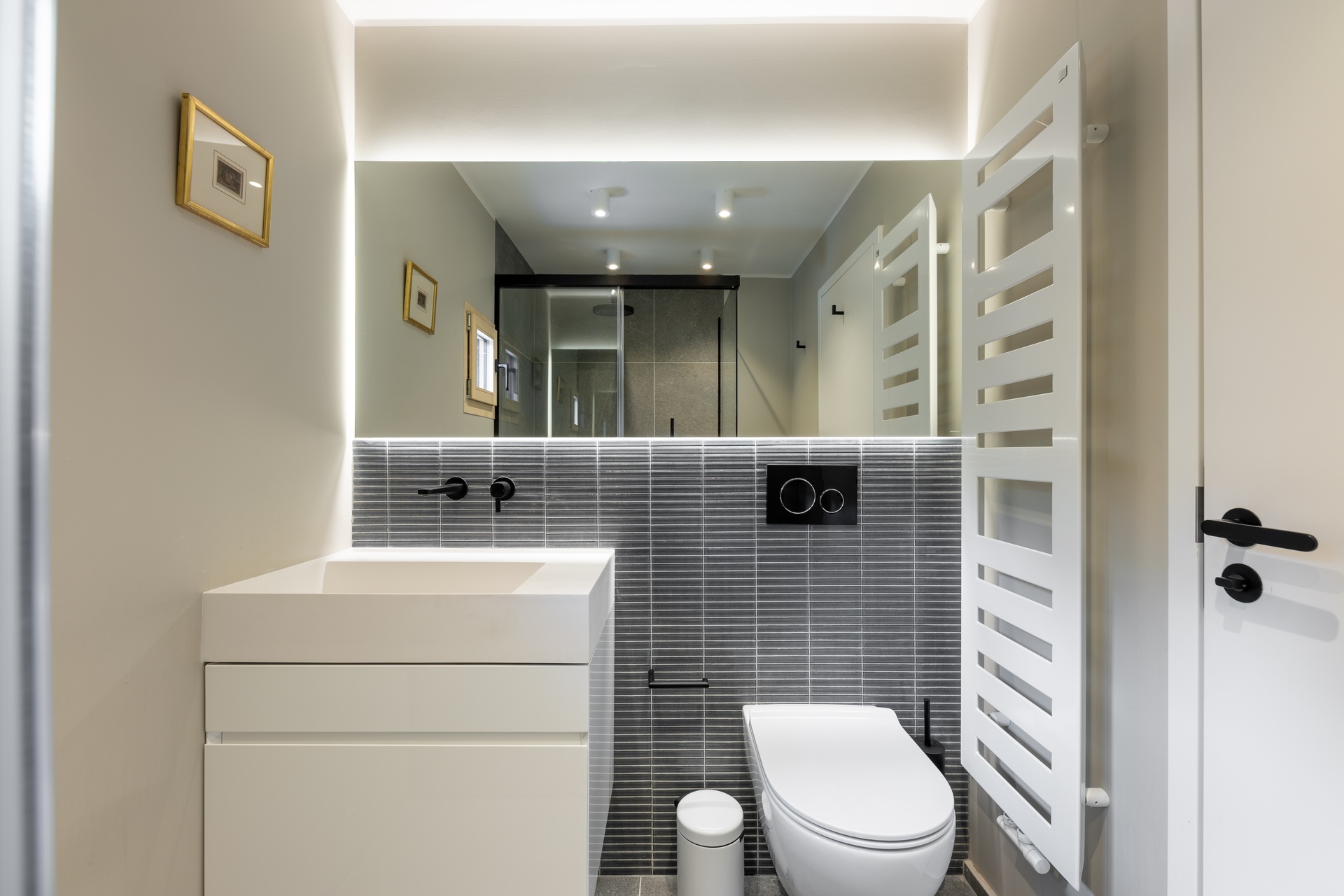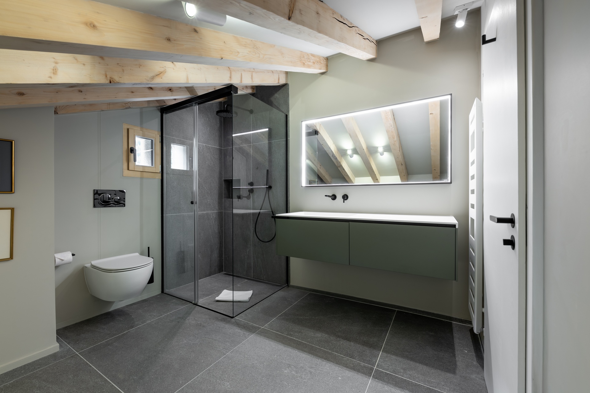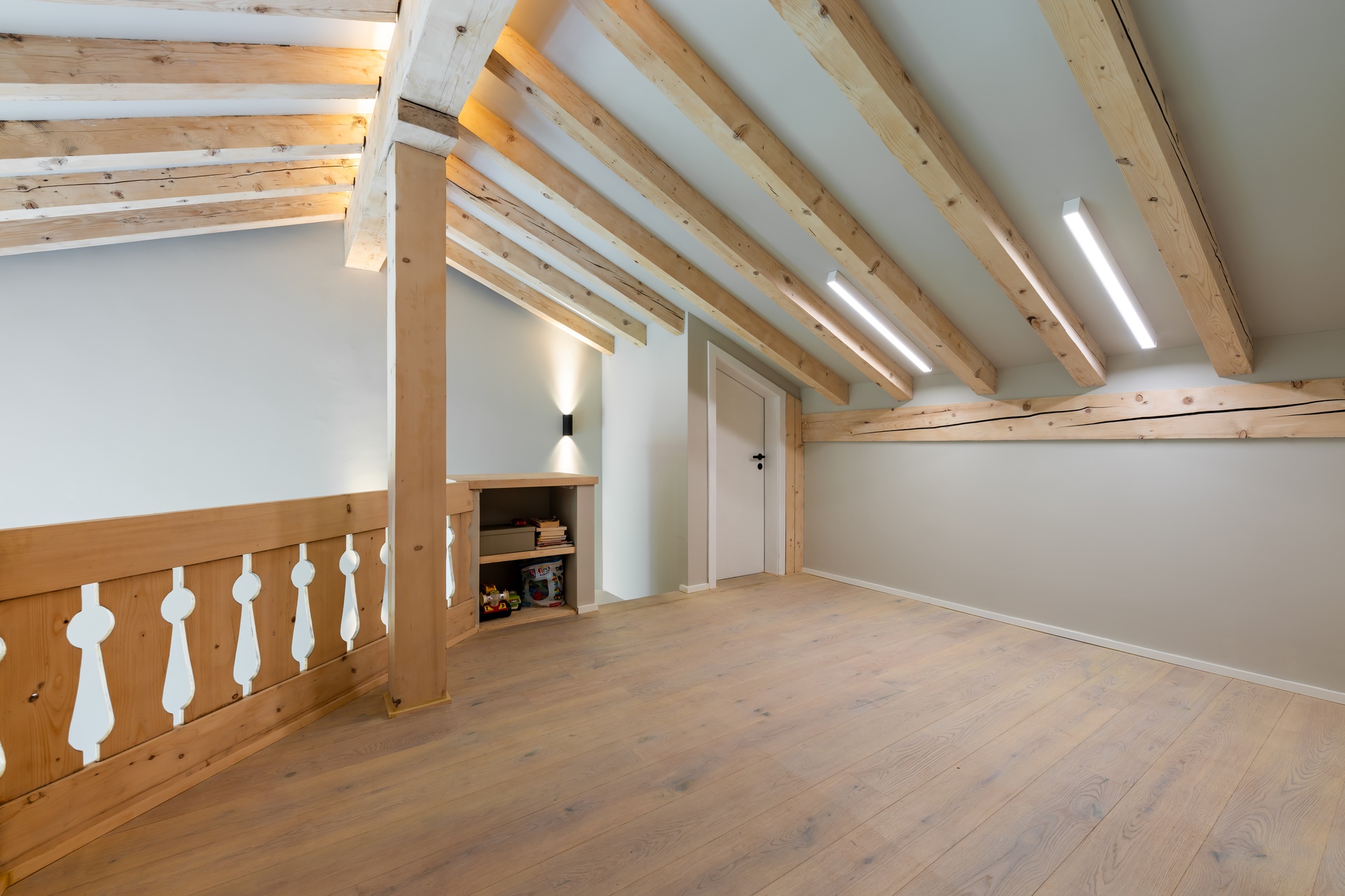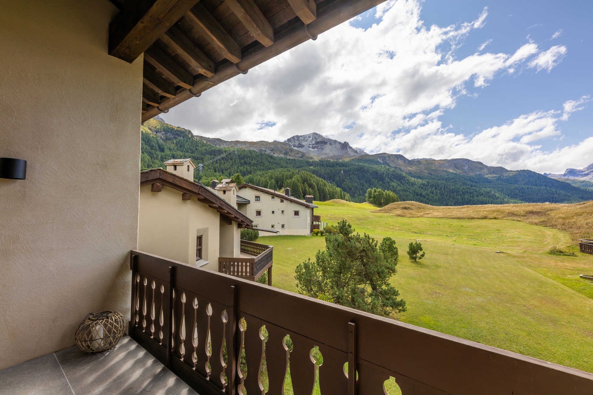 The upper floor is dedicated to a luxurious double bedroom and a bathroom with shower. The lower level offers a bright living room with an elegant wooden ceiling, an expansive picture window, and a generous balcony showcasing uninterrupted panoramic views of the Engadine Valley and Swiss Alps. Two additional bedrooms with adjacent bathrooms are also located on this floor. The kitchen is equipped with premium appliances and high-end finishes to satisfy even the most discerning guests.