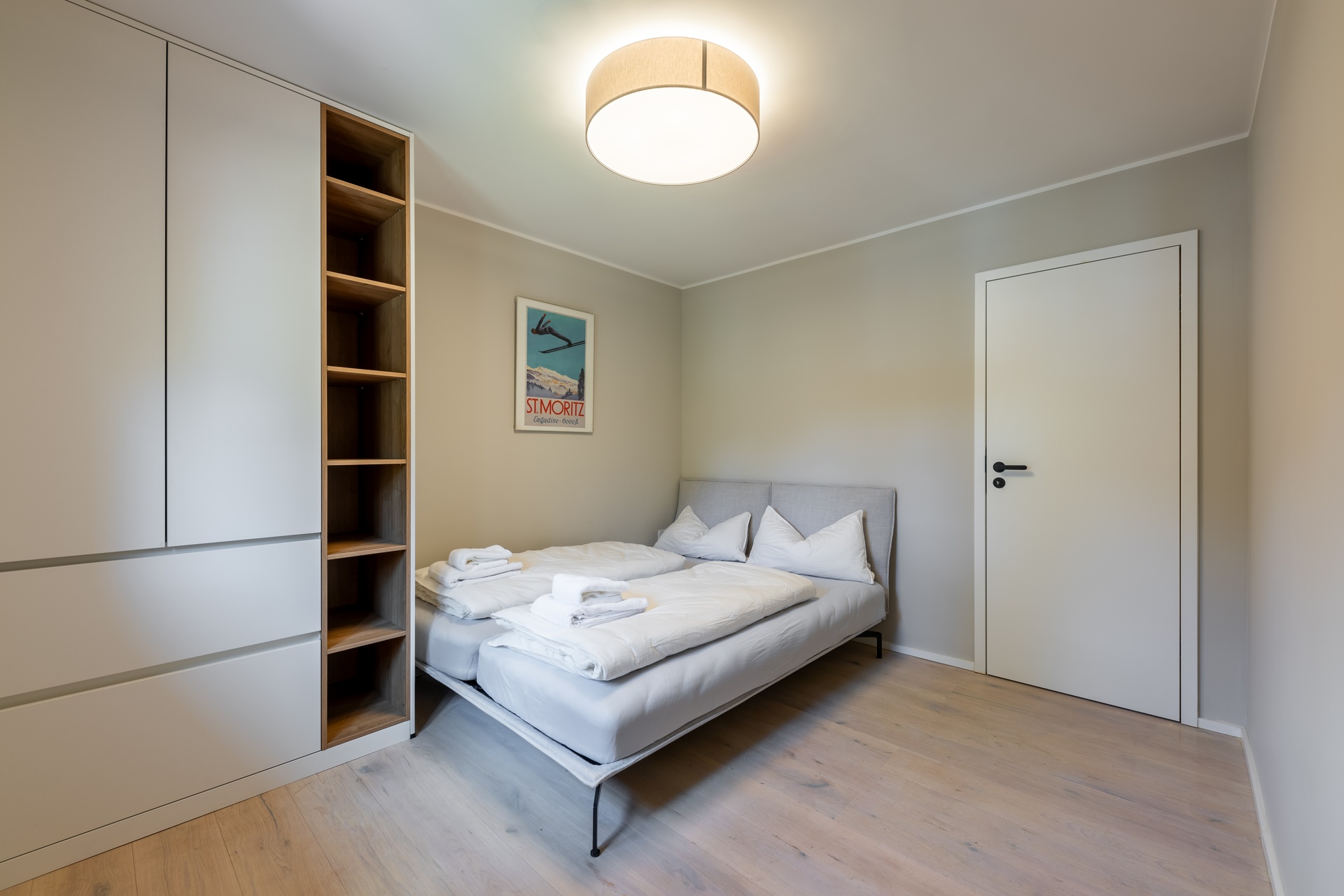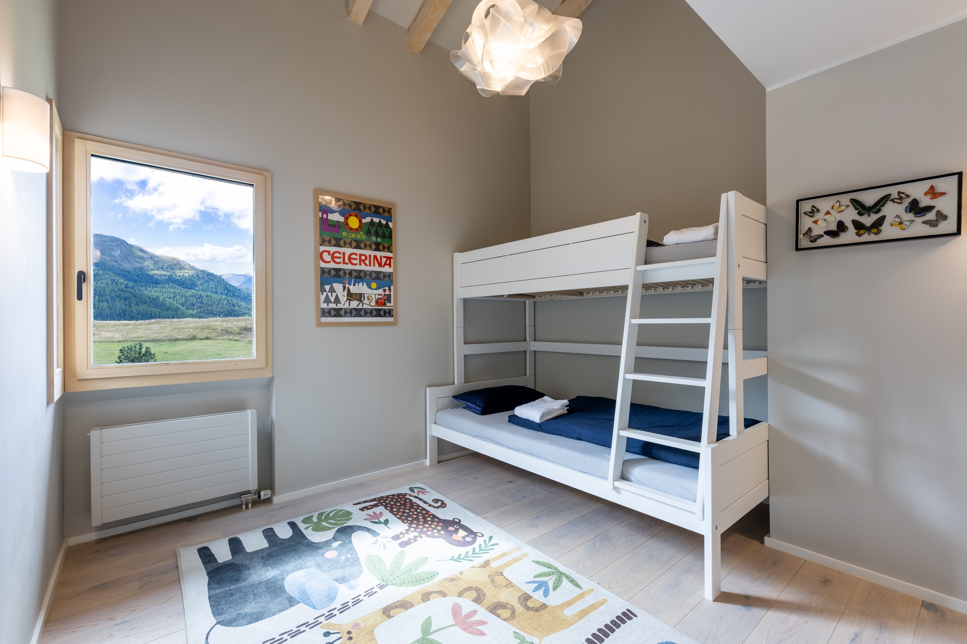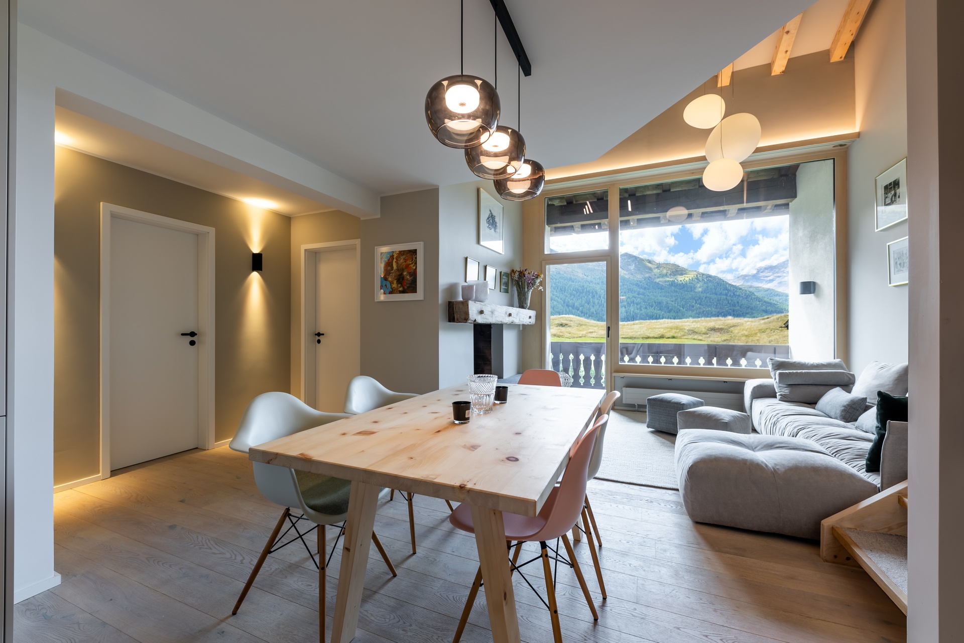 Just a short walk from the Corvatsch ski resort, this stylish and fully renovated duplex apartment on the second floor of the Crest’alta residence accommodates up to six guests. Spread across two levels, it features two spacious double bedrooms and a single bedroom with bunk beds, ideal for children.
