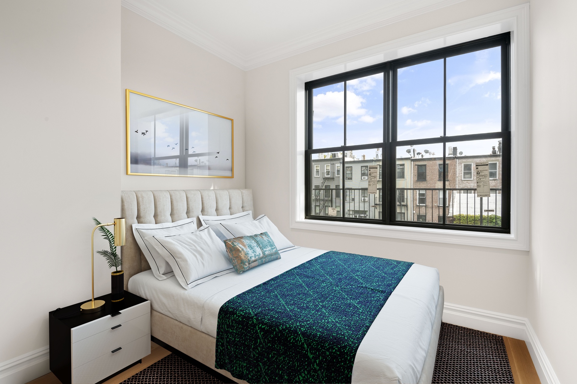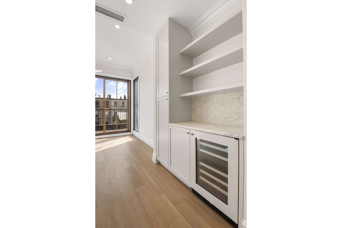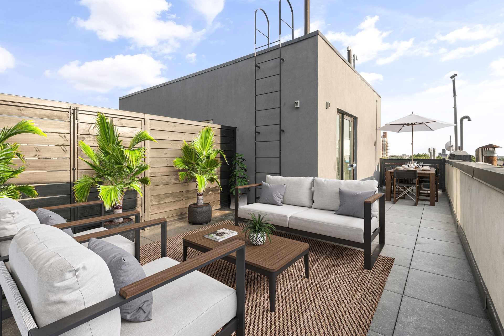 One of the most unique features of Residence 3 is the private roof deck and interior vestibule, accessed by a common staircase to the top floor. Mix cocktails and host parties while enjoying sunsets over the brownstone Brooklyn rooftops.