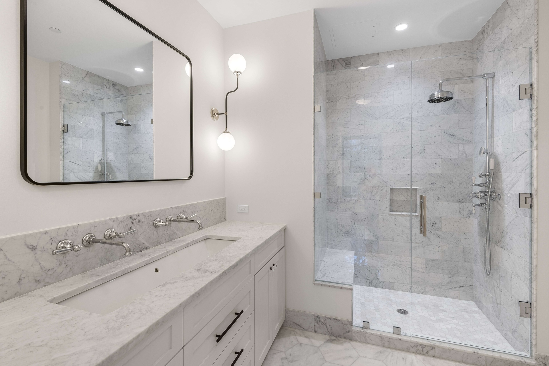 The separate living room is located facing the front of the home, at just under 300-square-feet of space and looking over the deep front gardens of Second Place. Sunlight bursts in through the two oversized two-over-two Marvin Ultimate windows. Three bedrooms are situated down a hallway, again allowing for privacy and quietness. The Primary bedroom features a wall-to-wall, floor-to-ceiling custom built-in closet and an en-suite marble bathroom with custom cabinetry, large sink basin with two faucet sets, walk-in shower with Cross Water London Belgravia Exposed Thermostatic shower set, and radiant floor heating. The secondary bathroom has a soaking tub/shower. Both bedroom 2 and bedroom 3 have deep closets and large double-hung windows looking south onto the private deck. In the hallway, there’s a stackable LG washer-dryer and an additional linen closet.