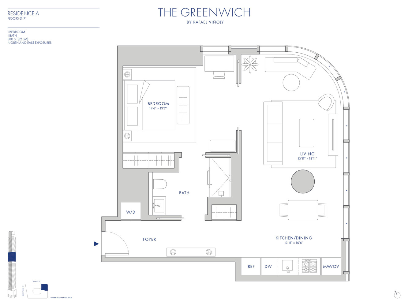 The complete offering terms are in an offering plan available from Sponsor. Sponsor: 125 Greenwich Owner LLC c/o: Fortress Investment Group LLC, 1345 Avenue of the Americas, 45th Floor New York, NY 10105. File no. CD15-0336. The artist representations and interior decorations, finishes, appliances and furnishings are provided for illustrative purposes only. All residential units are sold unfurnished. Sponsor makes no representations or warranties except as may be set forth in the offering plan. Sponsor reserves the right to substitute materials, appliances, equipment, fixtures and other construction and design details specified herein with similar materials, appliances, equipment and/or fixtures of substantially equal or better quality. All dimensions are approximate and subject to normal construction variances and tolerances. Square footage exceeds the usable floor area. Sponsor reserves the right to make changes in accordance with the terms of the offering plan. Plans and dimensions may contain minor variations from floor to floor. All dimensions and ceiling heights are approximate. Equal housing opportunity.