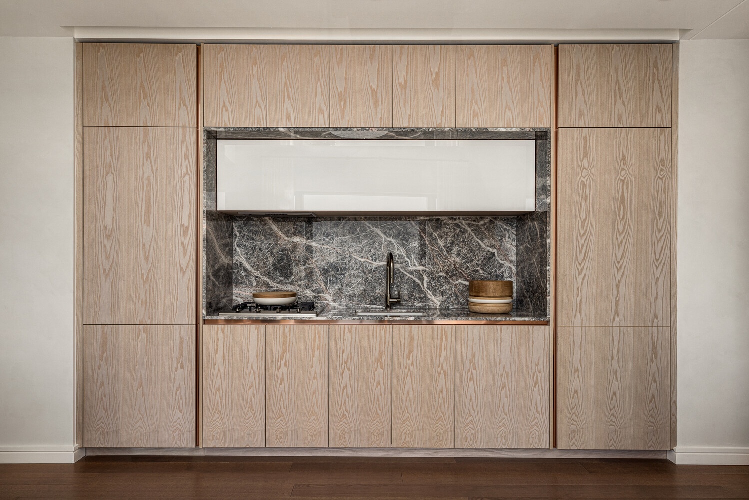 The formal entry foyer opens to the gracious living space, lined with 6" wide white oak flooring in light beige finish. The custom designed kitchen features a full suite of Miele appliances, including a vented hood, polished nickel fixtures, cabinets in light beige finish, and Fior di Pesco Carnica marble countertops and backsplash.